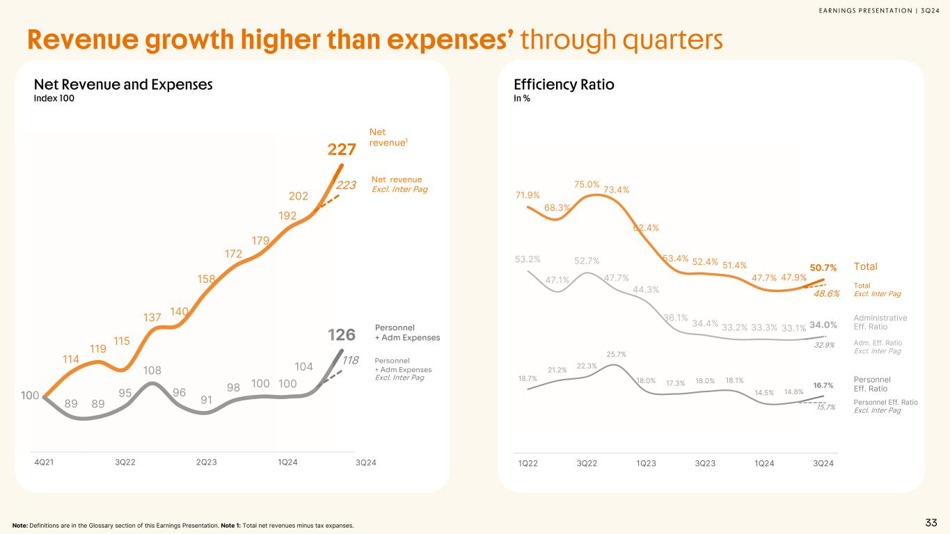 E A R N I N G S P R E S E N T A T I O N | 3 Q 2 4 Total Administrative Eff. Ratio Personnel Eff. Ratio Net Revenue and Expenses Index 100 Efficiency Ratio In % 71.9% 68.3% 75.0% 73.4% 62.4% 53.4% 52.4% 51.4% 47.7% 47.9% 50.7% 18.7% 21.2% 22.3% 25.7% 18.0% 17.3% 18.0% 18.1% 14.5% 14.8% 16.7% 53.2% 47.1% 52.7% 47.7% 44.3% 36.1% 34.4% 33.2% 33.3% 33.1% 34.0% 0 .0 % 10 .0 % 2 0. 0% 3 0. 0% 4 0. 0% 5 0. 0% 6 0. 0% 7 0. 0% 8 0. 0% 9 0. 0% 1Q22 3Q22 1Q23 3Q23 1Q24 3Q24 48.6% Total Excl. Inter Pag 32.9% Adm. Eff. Ratio Excl. Inter Pag 15.7% Personnel Eff. Ratio Excl. Inter Pag Personnel + Adm Expenses Net revenue1 114 119 115 137 140 158 172 179 192 202 227 100 89 89 95 108 96 91 98 100 100 104 126 7 0 10 0 13 0 16 0 19 0 2 20 2 50 4Q21 3Q22 2Q23 1Q24 223 Personnel + Adm Expenses Excl. Inter Pag 118 Net revenue Excl. Inter Pag 3Q24 33Note: Definitions are in the Glossary section of this Earnings Presentation. Note 1: Total net revenues minus tax expanses. Revenue growth higher than expenses’ through quarters