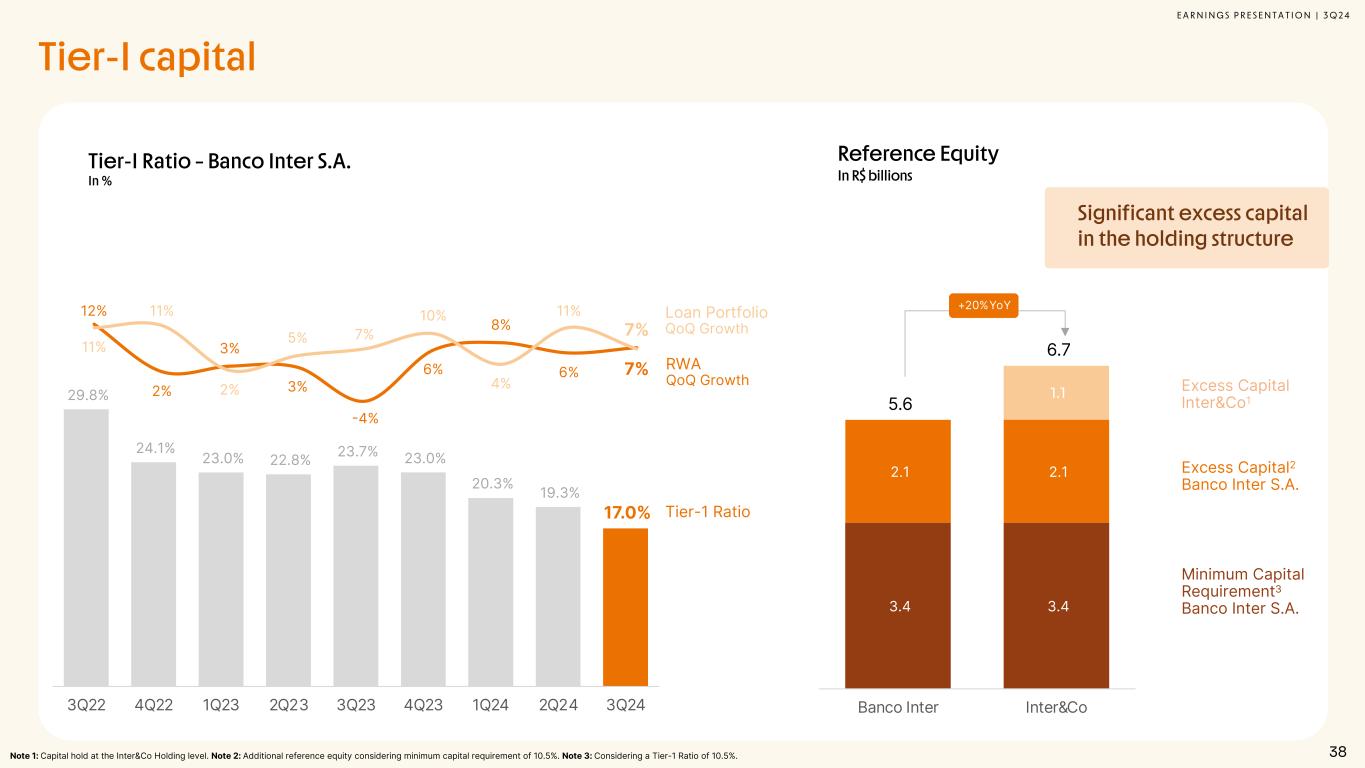 E A R N I N G S P R E S E N T A T I O N | 3 Q 2 4 38 Tier-I capital 29.8% 24.1% 23.0% 22.8% 23.7% 23.0% 20.3% 19.3% 17.0% 0 .0 % 5 .0 % 10 .0 % 15 .0 % 2 0. 0% 2 5. 0% 3 0. 0% 3 5. 0% 3Q22 4Q22 1Q23 2Q23 3Q23 4Q23 1Q24 2Q24 3Q24 Tier-I Ratio – Banco Inter S.A. In % 12% 2% 3% 3% -4% 6% 8% 6% 7% 11% 11% 2% 5% 7% 10% 4% 11% 7% -6% -4% -2% 0% 2% 4% 6% 8% 10% 12% Loan Portfolio QoQ Growth RWA QoQ Growth Tier-1 Ratio Minimum Capital Requirement3 Banco Inter S.A. Excess Capital2 Banco Inter S.A. 3.4 3.4 2.1 2.1 1.1 5.6 6.7 - 1 .0 2 .0 3 .0 4 .0 5 .0 6 .0 7 .0 8 .0 Banco Inter Inter&Co Excess Capital Inter&Co1 +20%YoY Reference Equity In R$ billions Significant excess capital in the holding structure Note 1: Capital hold at the Inter&Co Holding level. Note 2: Additional reference equity considering minimum capital requirement of 10.5%. Note 3: Considering a Tier-1 Ratio of 10.5%.