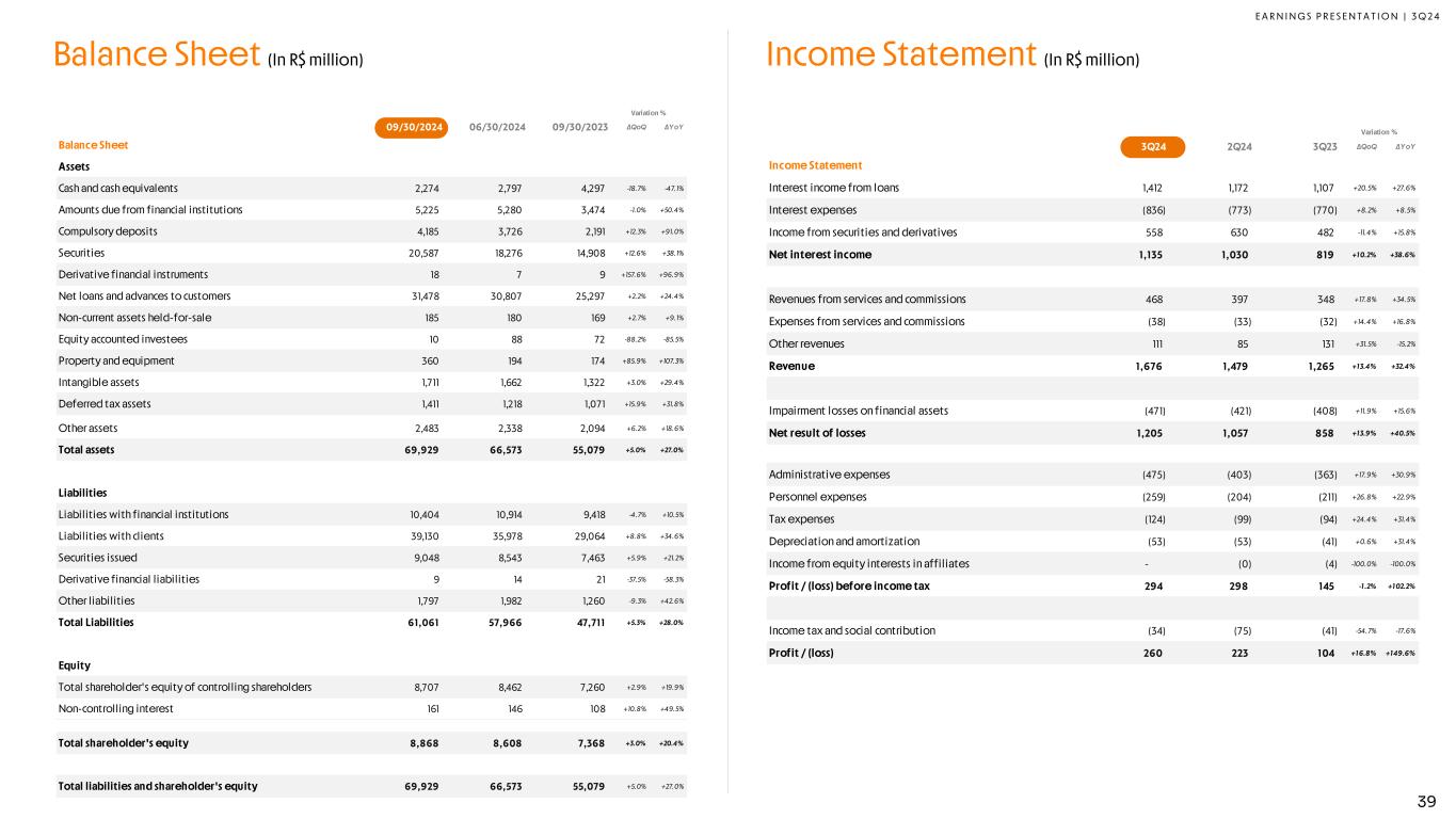 E A R N I N G S P R E S E N T A T I O N | 3 Q 2 4 Balance Sheet (In R$ million) Income Statement (In R$ million) 39 09/30/2024 06/30/2024 09/30/2023 ∆QoQ ∆YoY Balance Sheet Assets Cash and cash equivalents 2,274 2,797 4,297 -18.7% -47.1% Amounts due from financial institutions 5,225 5,280 3,474 -1.0% +50.4% Compulsory deposits 4,185 3,726 2,191 +12.3% +91.0% Securities 20,587 18,276 14,908 +12.6% +38.1% Derivative financial instruments 18 7 9 +157.6% +96.9% Net loans and advances to customers 31,478 30,807 25,297 +2.2% +24.4% Non-current assets held-for-sale 185 180 169 +2.7% +9.1% Equity accounted investees 10 88 72 -88.2% -85.5% Property and equipment 360 194 174 +85.9% +107.3% Intangible assets 1,711 1,662 1,322 +3.0% +29.4% Deferred tax assets 1,411 1,218 1,071 +15.9% +31.8% Variation % Other assets 2,483 2,338 2,094 +6.2% +18.6% Total assets 69,929 66,573 55,079 +5.0% +27.0% Liabilities Liabilities with financial institutions 10,404 10,914 9,418 -4.7% +10.5% Liabilities with clients 39,130 35,978 29,064 +8.8% +34.6% Securities issued 9,048 8,543 7,463 +5.9% +21.2% Derivative financial liabilities 9 14 21 -37.5% -58.3% Other liabilities 1,797 1,982 1,260 -9.3% +42.6% Total Liabilities 61,061 57,966 47,711 +5.3% +28.0% Equity Total shareholder's equity of controlling shareholders 8,707 8,462 7,260 +2.9% +19.9% Non-controlling interest 161 146 108 +10.8% +49.5% Total shareholder's equity 8,868 8,608 7,368 +3.0% +20.4% Total liabilities and shareholder's equity 69,929 66,573 55,079 +5.0% +27.0% 3Q24 2Q24 3Q23 ∆QoQ ∆YoY Income Statement Interest income from loans 1,412 1,172 1,107 +20.5% +27.6% Interest expenses (836) (773) (770) +8.2% +8.5% Income from securities and derivatives 558 630 482 -11.4% +15.8% Net interest income 1,135 1,030 819 +10.2% +38.6% Revenues from services and commissions 468 397 348 +17.8% +34.5% Expenses from services and commissions (38) (33) (32) +14.4% +16.8% Other revenues 111 85 131 +31.5% -15.2% Revenue 1,676 1,479 1,265 +13.4% +32.4% Impairment losses on financial assets (471) (421) (408) +11.9% +15.6% Net result of losses 1,205 1,057 858 +13.9% +40.5% Variation % Administrative expenses (475) (403) (363) +17.9% +30.9% Personnel expenses (259) (204) (211) +26.8% +22.9% Tax expenses (124) (99) (94) +24.4% +31.4% Depreciation and amortization (53) (53) (41) +0.6% +31.4% Income from equity interests in affiliates - (0) (4) -100.0% -100.0% Profit / (loss) before income tax 294 298 145 -1.2% +102.2% Income tax and social contribution (34) (75) (41) -54.7% -17.6% Profit / (loss) 260 223 104 +16.8% +149.6%