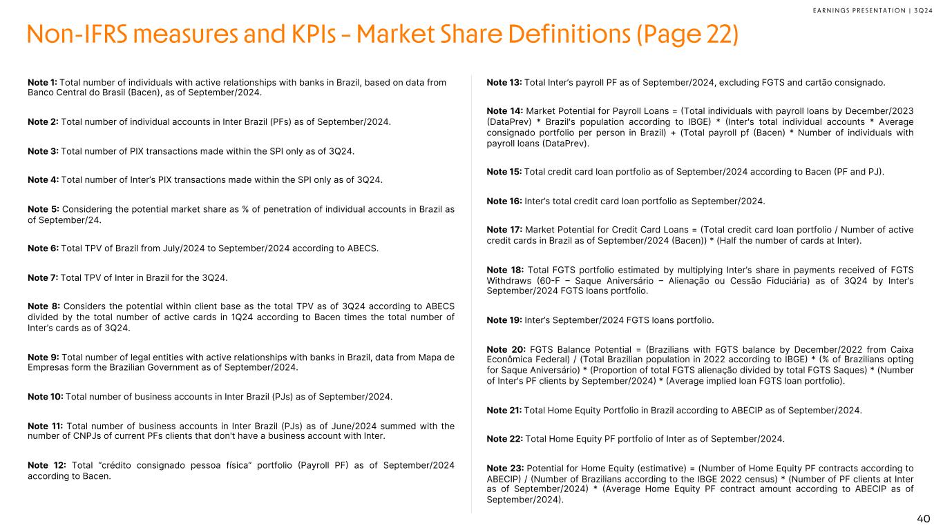 E A R N I N G S P R E S E N T A T I O N | 3 Q 2 4 40 Non-IFRS measures and KPIs – Market Share Definitions (Page 22) Note 1: Total number of individuals with active relationships with banks in Brazil, based on data from Banco Central do Brasil (Bacen), as of September/2024. Note 2: Total number of individual accounts in Inter Brazil (PFs) as of September/2024. Note 3: Total number of PIX transactions made within the SPI only as of 3Q24. Note 4: Total number of Inter’s PIX transactions made within the SPI only as of 3Q24. Note 5: Considering the potential market share as % of penetration of individual accounts in Brazil as of September/24. Note 6: Total TPV of Brazil from July/2024 to September/2024 according to ABECS. Note 7: Total TPV of Inter in Brazil for the 3Q24. Note 8: Considers the potential within client base as the total TPV as of 3Q24 according to ABECS divided by the total number of active cards in 1Q24 according to Bacen times the total number of Inter’s cards as of 3Q24. Note 9: Total number of legal entities with active relationships with banks in Brazil, data from Mapa de Empresas form the Brazilian Government as of September/2024. Note 10: Total number of business accounts in Inter Brazil (PJs) as of September/2024. Note 11: Total number of business accounts in Inter Brazil (PJs) as of June/2024 summed with the number of CNPJs of current PFs clients that don't have a business account with Inter. Note 12: Total “crédito consignado pessoa física” portfolio (Payroll PF) as of September/2024 according to Bacen. Note 13: Total Inter’s payroll PF as of September/2024, excluding FGTS and cartão consignado. Note 14: Market Potential for Payroll Loans = (Total individuals with payroll loans by December/2023 (DataPrev) * Brazil's population according to IBGE) * (Inter's total individual accounts * Average consignado portfolio per person in Brazil) + (Total payroll pf (Bacen) * Number of individuals with payroll loans (DataPrev). Note 15: Total credit card loan portfolio as of September/2024 according to Bacen (PF and PJ). Note 16: Inter’s total credit card loan portfolio as September/2024. Note 17: Market Potential for Credit Card Loans = (Total credit card loan portfolio / Number of active credit cards in Brazil as of September/2024 (Bacen)) * (Half the number of cards at Inter). Note 18: Total FGTS portfolio estimated by multiplying Inter’s share in payments received of FGTS Withdraws (60-F – Saque Aniversário – Alienação ou Cessão Fiduciária) as of 3Q24 by Inter’s September/2024 FGTS loans portfolio. Note 19: Inter’s September/2024 FGTS loans portfolio. Note 20: FGTS Balance Potential = (Brazilians with FGTS balance by December/2022 from Caixa Econômica Federal) / (Total Brazilian population in 2022 according to IBGE) * (% of Brazilians opting for Saque Aniversário) * (Proportion of total FGTS alienação divided by total FGTS Saques) * (Number of Inter's PF clients by September/2024) * (Average implied loan FGTS loan portfolio). Note 21: Total Home Equity Portfolio in Brazil according to ABECIP as of September/2024. Note 22: Total Home Equity PF portfolio of Inter as of September/2024. Note 23: Potential for Home Equity (estimative) = (Number of Home Equity PF contracts according to ABECIP) / (Number of Brazilians according to the IBGE 2022 census) * (Number of PF clients at Inter as of September/2024) * (Average Home Equity PF contract amount according to ABECIP as of September/2024).