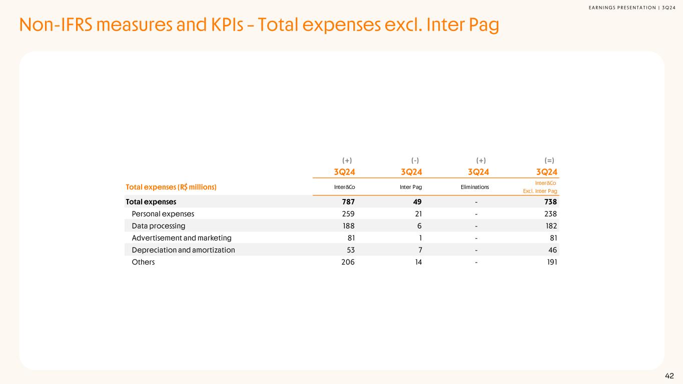 E A R N I N G S P R E S E N T A T I O N | 3 Q 2 4 41 Non-IFRS measures and KPIs – Revenue Excl. Inter Pag (+) (-) (+) (=) 3Q24 3Q24 3Q24 3Q24 Total gross revenues (R$ millions) Inter&Co Inter Pag Eliminations Inter&Co Excl. Inter Pag Total gross revenues 2,684 55 9 2,638 Interest income 1,412 28 9 1,393 Income from securities and derivatives 558 - - 558 Gross revenues from services and commissions 468 24 - 444 Other revenues 111 4 - 108 (+) Cashback expenses 104 - - 104 (+) Inter rewards 30 - - 30 (+) (-) (+) (=) 3Q24 3Q24 3Q24 3Q24 Total net revenues (R$ millions) Inter&Co Inter Pag Eliminations Inter&Co Excl. Inter Pag Total net revenues 1,676 43 9 1,641 Net fee revenues 541 24 - 517 Net revenues from services and commissions 430 21 - 409 Other revenues 111 4 - 108 Net interest income 1,135 19 9 1,125 Interest income 1,412 28 9 1,393 Income from securities and derivatives 558 - - 558 Interest expenses (836) (9) - (827)