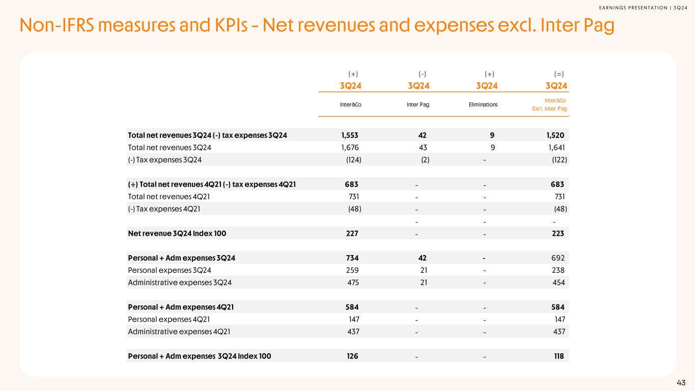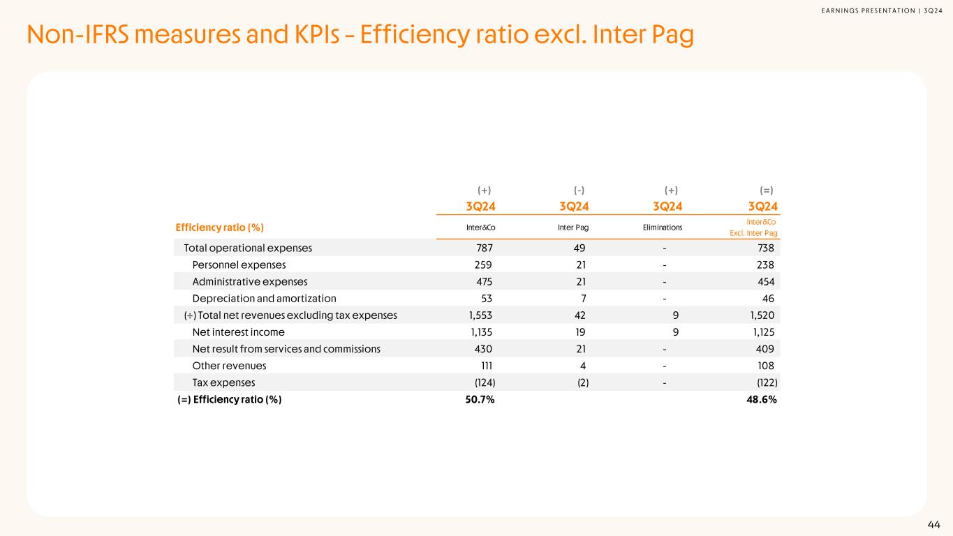 E A R N I N G S P R E S E N T A T I O N | 3 Q 2 4 43 Non-IFRS measures and KPIs – Net revenues and expenses excl. Inter Pag (+) (-) (+) (=) 3Q24 3Q24 3Q24 3Q24 Inter&Co Inter Pag Eliminations Inter&Co Excl. Inter Pag Total net revenues 3Q24 (-) tax expenses 3Q24 1,553 42 9 1,520 Total net revenues 3Q24 1,676 43 9 1,641 (-) Tax expenses 3Q24 (124) (2) - (122) (÷) Total net revenues 4Q21 (-) tax expenses 4Q21 683 - - 683 Total net revenues 4Q21 731 - - 731 (-) Tax expenses 4Q21 (48) - - (48) - - - Net revenue 3Q24 Index 100 227 - - 223 Personal + Adm expenses 3Q24 734 42 - 692 Personal expenses 3Q24 259 21 - 238 Administrative expenses 3Q24 475 21 - 454 Personal + Adm expenses 4Q21 584 - - 584 Personal expenses 4Q21 147 - - 147 Administrative expenses 4Q21 437 - - 437 Personal + Adm expenses 3Q24 Index 100 126 - - 118