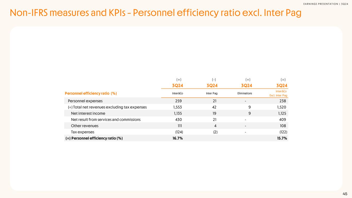 E A R N I N G S P R E S E N T A T I O N | 3 Q 2 4 44 Non-IFRS measures and KPIs – Efficiency ratio excl. Inter Pag (+) (-) (+) (=) 3Q24 3Q24 3Q24 3Q24 Efficiency ratio (%) Inter&Co Inter Pag Eliminations Inter&Co Excl. Inter Pag Total operational expenses 787 49 - 738 Personnel expenses 259 21 - 238 Administrative expenses 475 21 - 454 Depreciation and amortization 53 7 - 46 (÷) Total net revenues excluding tax expenses 1,553 42 9 1,520 Net interest income 1,135 19 9 1,125 Net result from services and commissions 430 21 - 409 Other revenues 111 4 - 108 Tax expenses (124) (2) - (122)  (=) Efficiency ratio (%) 50.7% 48.6%