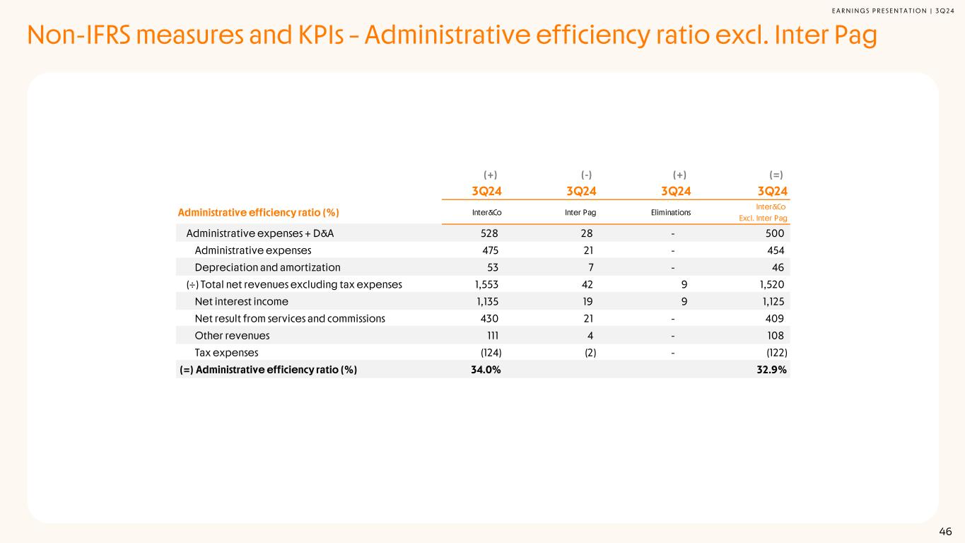 E A R N I N G S P R E S E N T A T I O N | 3 Q 2 4 45 Non-IFRS measures and KPIs – Personnel efficiency ratio excl. Inter Pag (+) (-) (+) (=) 3Q24 3Q24 3Q24 3Q24 Personnel efficiency ratio  (%) Inter&Co Inter Pag Eliminations Inter&Co Excl. Inter Pag Personnel expenses 259 21 - 238 (÷) Total net revenues excluding tax expenses 1,553 42 9 1,520 Net interest income 1,135 19 9 1,125 Net result from services and commissions 430 21 - 409 Other revenues 111 4 - 108 Tax expenses (124) (2) - (122)  (=) Personnel efficiency ratio (%) 16.7% 15.7%