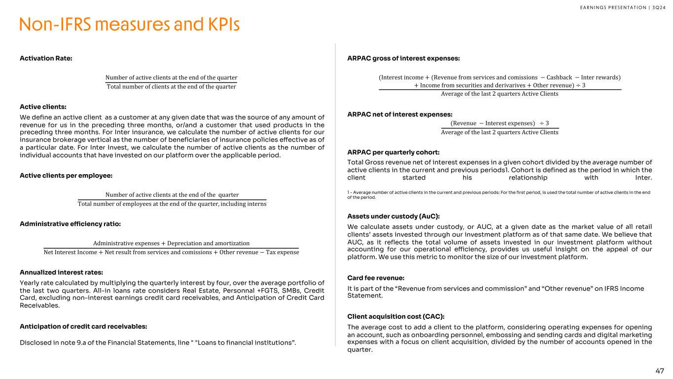 E A R N I N G S P R E S E N T A T I O N | 3 Q 2 4 47 Non-IFRS measures and KPIs Activation Rate: Number of active clients at the end of the quarter Total number of clients at the end of the quarter Active clients: We define an active client as a customer at any given date that was the source of any amount of revenue for us in the preceding three months, or/and a customer that used products in the preceding three months. For Inter insurance, we calculate the number of active clients for our insurance brokerage vertical as the number of beneficiaries of insurance policies e!ective as of a particular date. For Inter Invest, we calculate the number of active clients as the number of individual accounts that have invested on our platform over the applicable period. Active clients per employee: Number of active clients at the end of the quarter Total number of employees at the end of the quarter, including interns Administrative e!ciency ratio: Administrative expenses + Depreciation and amortization Net Interest Income + Net result from services and comissions + Other revenue − Tax expense Annualized interest rates: Yearly rate calculated by multiplying the quarterly interest by four, over the average portfolio of the last two quarters. All-in loans rate considers Real Estate, Personnal +FGTS, SMBs, Credit Card, excluding non-interest earnings credit card receivables, and Anticipation of Credit Card Receivables. Anticipation of credit card receivables: Disclosed in note 9.a of the Financial Statements, line " "Loans to financial institutions”. ARPAC gross of interest expenses: (Interest income + (Revenue from services and comissions − Cashback − Inter rewards) + Income from securities and derivarives + Other revenue) ÷ 3 Average of the last 2 quarters Active Clients ARPAC net of interest expenses: (Revenue − Interest expenses) ÷ 3 Average of the last 2 quarters Active Clients ARPAC per quarterly cohort: Total Gross revenue net of interest expenses in a given cohort divided by the average number of active clients in the current and previous periods1. Cohort is defined as the period in which the client started his relationship with Inter. 1 - Average number of active clients in the current and previous periods: For the first period, is used the total number of active clients in the end of the period. Assets under custody (AuC): We calculate assets under custody, or AUC, at a given date as the market value of all retail clients’ assets invested through our investment platform as of that same date. We believe that AUC, as it reflects the total volume of assets invested in our investment platform without accounting for our operational e"ciency, provides us useful insight on the appeal of our platform. We use this metric to monitor the size of our investment platform. Card fee revenue: It is part of the “Revenue from services and commission” and “Other revenue” on IFRS Income Statement. Client acquisition cost (CAC): The average cost to add a client to the platform, considering operating expenses for opening an account, such as onboarding personnel, embossing and sending cards and digital marketing expenses with a focus on client acquisition, divided by the number of accounts opened in the quarter.