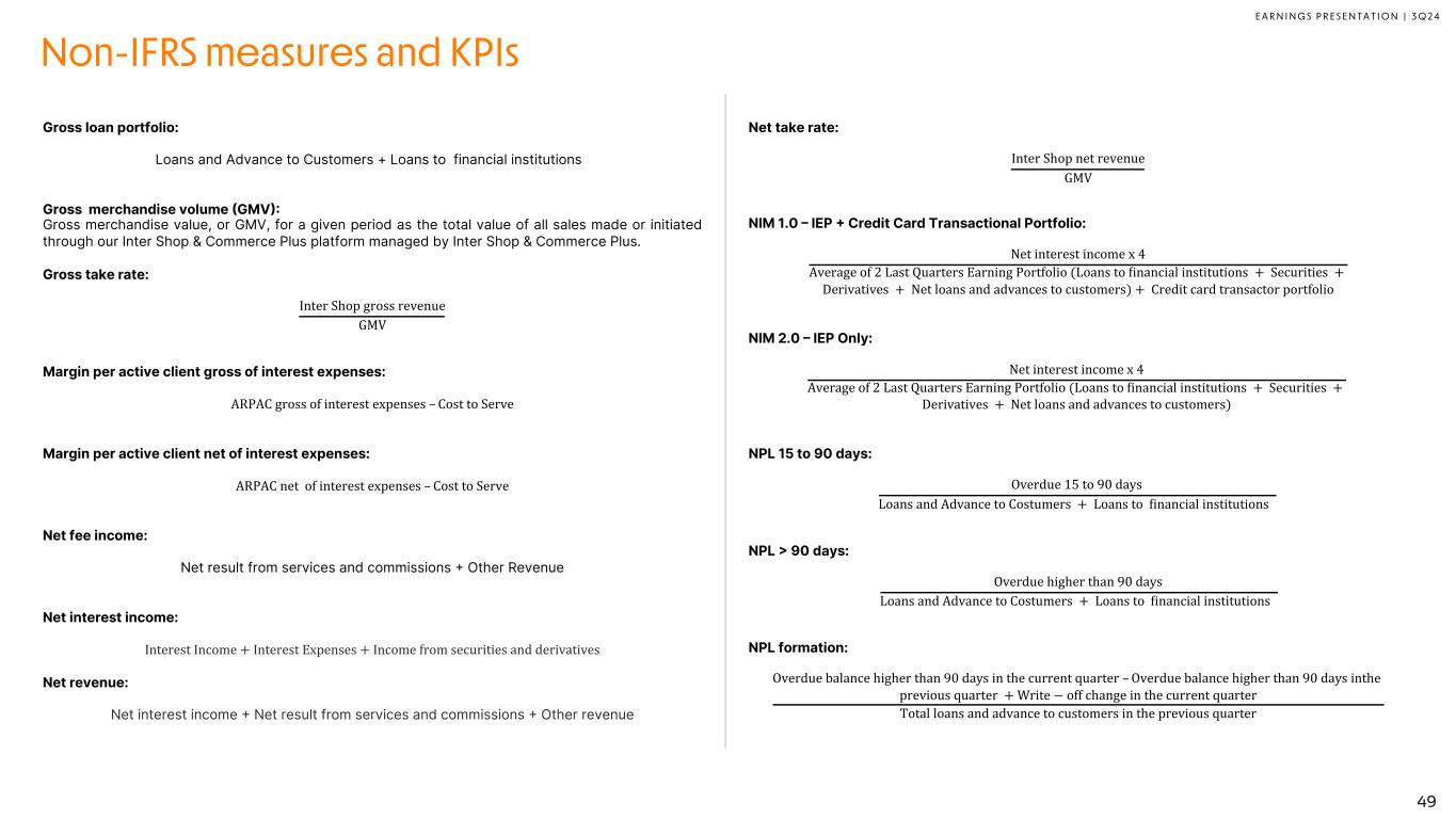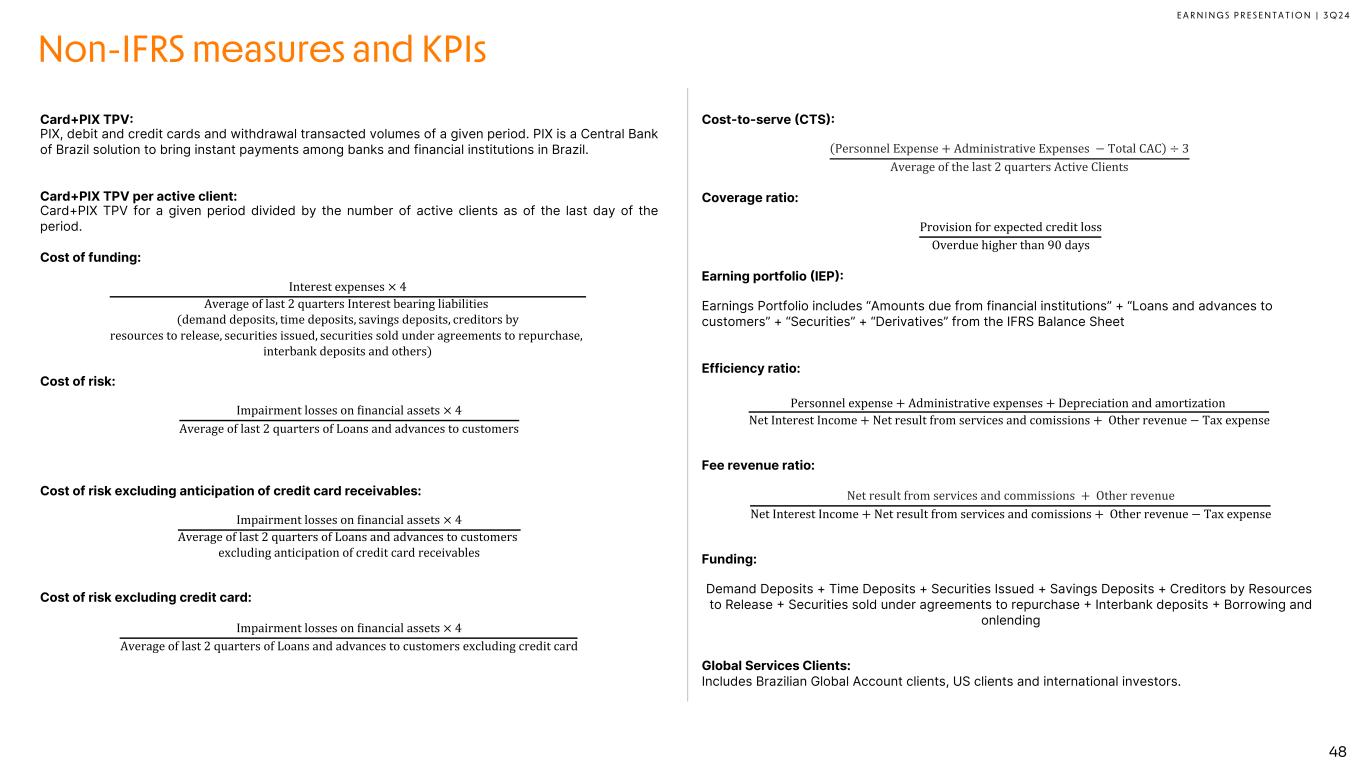 E A R N I N G S P R E S E N T A T I O N | 3 Q 2 4 48 Non-IFRS measures and KPIs Card+PIX TPV: PIX, debit and credit cards and withdrawal transacted volumes of a given period. PIX is a Central Bank of Brazil solution to bring instant payments among banks and financial institutions in Brazil. Card+PIX TPV per active client: Card+PIX TPV for a given period divided by the number of active clients as of the last day of the period. Cost of funding: Interest expenses × 4 Average of last 2 quarters Interest bearing liabilities (demand deposits, time deposits, savings deposits, creditors by resources to release, securities issued, securities sold under agreements to repurchase, interbank deposits and others) Cost of risk: Impairment losses on Minancial assets × 4 Average of last 2 quarters of Loans and advances to customers Cost of risk excluding anticipation of credit card receivables: Impairment losses on Minancial assets × 4 Average of last 2 quarters of Loans and advances to customers excluding anticipation of credit card receivables Cost of risk excluding credit card: Impairment losses on Minancial assets × 4 Average of last 2 quarters of Loans and advances to customers excluding credit card Cost-to-serve (CTS): Personnel Expense + Administrative Expenses − Total CAC ÷ 3 Average of the last 2 quarters Active Clients Coverage ratio: Provision for expected credit loss Overdue higher than 90 days Earning portfolio (IEP): Earnings Portfolio includes “Amounts due from financial institutions” + “Loans and advances to customers” + “Securities” + “Derivatives” from the IFRS Balance Sheet Efficiency ratio: Personnel expense + Administrative expenses + Depreciation and amortization Net Interest Income + Net result from services and comissions + Other revenue − Tax expense Fee revenue ratio: Net result from services and commissions + Other revenue Net Interest Income + Net result from services and comissions + Other revenue − Tax expense Funding: Demand Deposits + Time Deposits + Securities Issued + Savings Deposits + Creditors by Resources to Release + Securities sold under agreements to repurchase + Interbank deposits + Borrowing and onlending Global Services Clients: Includes Brazilian Global Account clients, US clients and international investors.