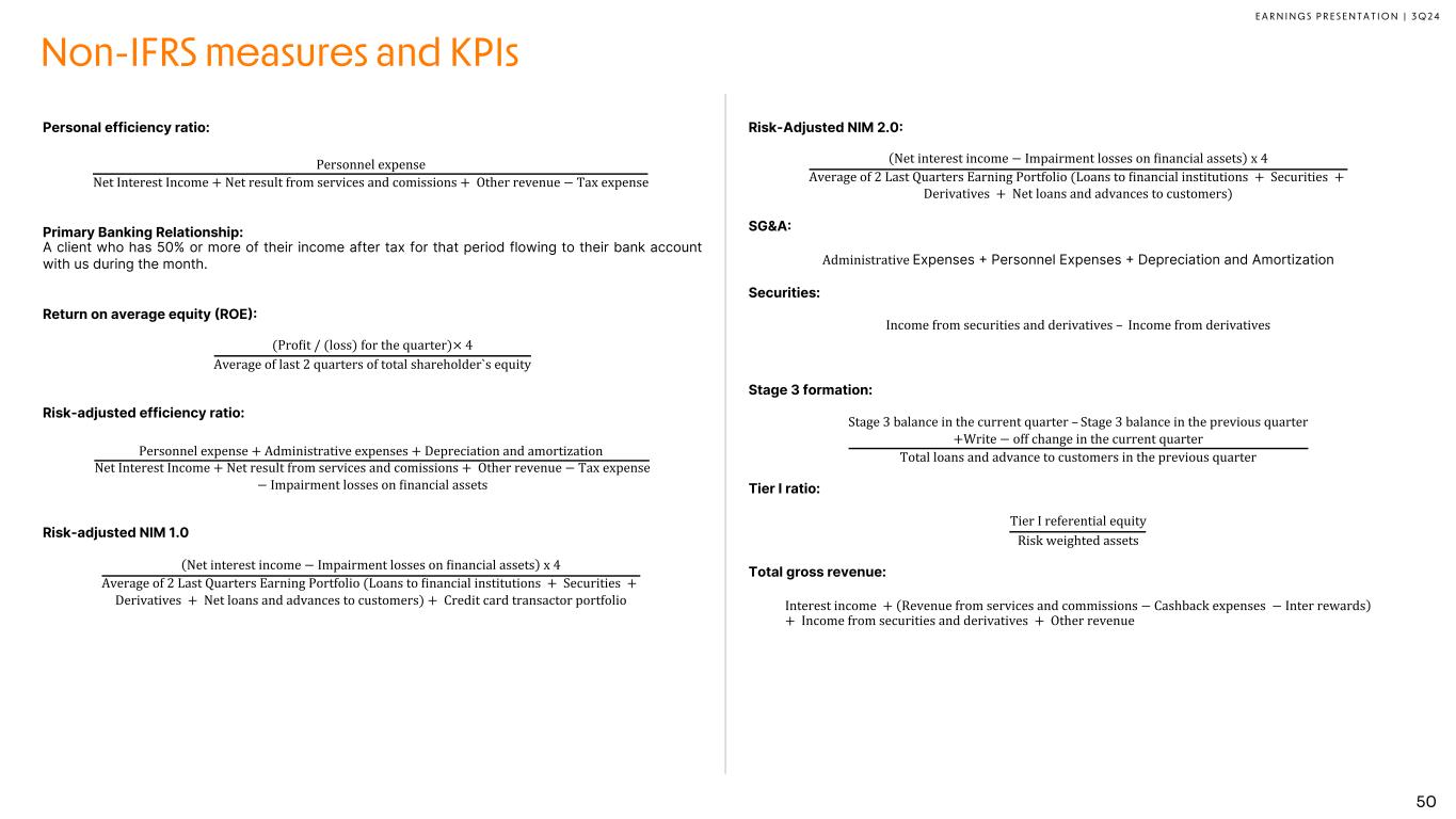E A R N I N G S P R E S E N T A T I O N | 3 Q 2 4 50 Non-IFRS measures and KPIs Risk-Adjusted NIM 2.0: Net interest income − Impairment losses on Minancial assets x 4 Average of 2 Last Quarters Earning Portfolio (Loans to Minancial institutions + Securities + Derivatives + Net loans and advances to customers) SG&A: Administrative Expenses + Personnel Expenses + Depreciation and Amortization Securities: Income from securities and derivatives – Income from derivatives Stage 3 formation: Stage 3 balance in the current quarter – Stage 3 balance in the previous quarter +Write − off change in the current quarter Total loans and advance to customers in the previous quarter Tier I ratio: Tier I referential equity Risk weighted assets Total gross revenue: Interest income + Revenue from services and commissions − Cashback expenses − Inter rewards + Income from securities and derivatives + Other revenue Personal efficiency ratio: Personnel expense Net Interest Income + Net result from services and comissions + Other revenue − Tax expense Primary Banking Relationship: A client who has 50% or more of their income after tax for that period flowing to their bank account with us during the month. Return on average equity (ROE): (ProMit / (loss) for the quarter)× 4 Average of last 2 quarters of total shareholder`s equity Risk-adjusted efficiency ratio: Personnel expense + Administrative expenses + Depreciation and amortization Net Interest Income + Net result from services and comissions + Other revenue − Tax expense − Impairment losses on Minancial assets Risk-adjusted NIM 1.0 Net interest income − Impairment losses on Minancial assets x 4 Average of 2 Last Quarters Earning Portfolio (Loans to Minancial institutions + Securities + Derivatives + Net loans and advances to customers) + Credit card transactor portfolio