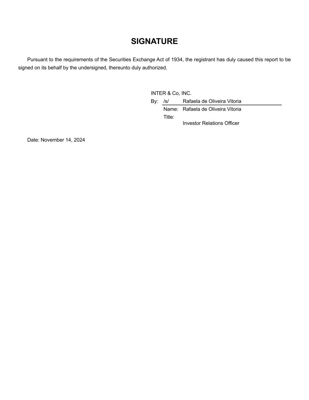 SIGNATURE Pursuant to the requirements of the Securities Exchange Act of 1934, the registrant has duly caused this report to be signed on its behalf by the undersigned, thereunto duly authorized. INTER & Co, INC. By: /s/ Rafaela de Oliveira Vitoria Name: Rafaela de Oliveira Vitoria Title: Investor Relations Officer Date: November 14, 2024