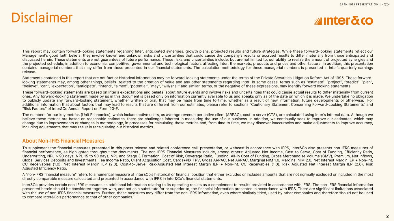 E A R N I N G S P R E S E N T A T I O N | 4 Q 2 4 Disclaimer This report may contain forward-looking statements regarding Inter, anticipated synergies, growth plans, projected results and future strategies. While these forward-looking statements reflect our Management’s good faith beliefs, they involve known and unknown risks and uncertainties that could cause the company’s results or accrued results to differ materially from those anticipated and discussed herein. These statements are not guarantees of future performance. These risks and uncertainties include, but are not limited to, our ability to realize the amount of projected synergies and the projected schedule, in addition to economic, competitive, governmental and technological factors affecting Inter, the markets, products and prices and other factors. In addition, this presentation contains managerial numbers that may differ from those presented in our financial statements. The calculation methodology for these managerial numbers is presented in Inter’s quarterly earnings release. Statements contained in this report that are not fact or historical information may be forward-looking statements under the terms of the Private Securities Litigation Reform Act of 1995. These forward- looking statements may, among other things, beliefs related to the creation of value and any other statements regarding Inter. In some cases, terms such as “estimate”, “project”, “predict”, “plan”, “believe”, “can”, “expectation”, “anticipate”, “intend”, “aimed”, “potential”, “may”, “will/shall” and similar terms, or the negative of these expressions, may identify forward looking statements. These forward-looking statements are based on Inter's expectations and beliefs about future events and involve risks and uncertainties that could cause actual results to differ materially from current ones. Any forward-looking statement made by us in this document is based only on information currently available to us and speaks only as of the date on which it is made. We undertake no obligation to publicly update any forward-looking statement, whether written or oral, that may be made from time to time, whether as a result of new information, future developments or otherwise. For additional information that about factors that may lead to results that are different from our estimates, please refer to sections “Cautionary Statement Concerning Forward-Looking Statements” and “Risk Factors” of Inter&Co Annual Report on Form 20-F. The numbers for our key metrics (Unit Economics), which include active users, as average revenue per active client (ARPAC), cost to serve (CTS), are calculated using Inter’s internal data. Although we believe these metrics are based on reasonable estimates, there are challenges inherent in measuring the use of our business. In addition, we continually seek to improve our estimates, which may change due to improvements or changes in methodology, in processes for calculating these metrics and, from time to time, we may discover inaccuracies and make adjustments to improve accuracy, including adjustments that may result in recalculating our historical metrics. About Non-IFRS Financial Measures To supplement the financial measures presented in this press release and related conference call, presentation, or webcast in accordance with IFRS, Inter&Co also presents non-IFRS measures of financial performance, as highlighted throughout the documents. The non-IFRS Financial Measures include, among others: Adjusted Net Income, Cost to Serve, Cost of Funding, Efficiency Ratio, Underwriting, NPL > 90 days, NPL 15 to 90 days, NPL and Stage 3 Formation, Cost of Risk, Coverage Ratio, Funding, All-in Cost of Funding, Gross Merchandise Volume (GMV), Premium, Net Inflows, Global Services Deposits and Investments, Fee Income Ratio, Client Acquisition Cost, Cards+PIX TPV, Gross ARPAC, Net ARPAC, Marginal NIM 1.0, Marginal NIM 2.0, Net Interest Margin IEP + Non-int. CC Receivables (1.0), Net Interest Margin IEP (2.0), Cost-to-Serve, Risk-Adjusted Net Interest Margin IEP + Non-int. CC Receivables (1.0), Risk Adjusted Net Interest Margin IEP (2.0), Risk Adjusted Efficiency Ratio. A “non-IFRS financial measure” refers to a numerical measure of Inter&Co’s historical or financial position that either excludes or includes amounts that are not normally excluded or included in the most directly comparable measure calculated and presented in accordance with IFRS in Inter&Co’s financial statements. Inter&Co provides certain non-IFRS measures as additional information relating to its operating results as a complement to results provided in accordance with IFRS. The non-IFRS financial information presented herein should be considered together with, and not as a substitute for or superior to, the financial information presented in accordance with IFRS. There are significant limitations associated with the use of non-IFRS financial measures. Further, these measures may differ from the non-IFRS information, even where similarly titled, used by other companies and therefore should not be used to compare Inter&Co’s performance to that of other companies. 2