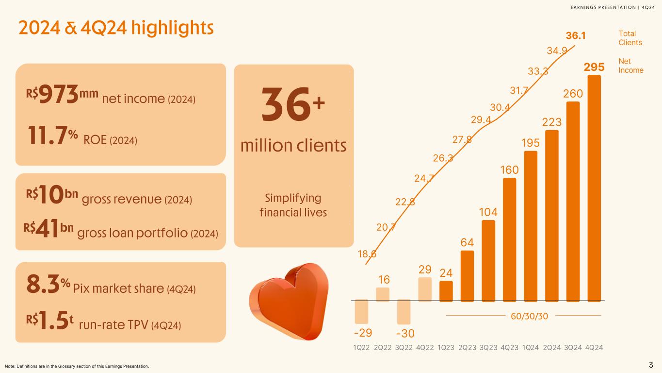 E A R N I N G S P R E S E N T A T I O N | 4 Q 2 4 18.6 20.7 22.8 24.7 26.3 27.8 29.4 30.4 31.7 33.3 34.9 36.1 1 0. 1 5.0 2 0. 2 5.0 3 0. 3 5.0 2024 & 4Q24 highlights 3Note: Definitions are in the Glossary section of this Earnings Presentation. Net Income Total Clients 60/30/30 R$973mm net income (2024) 11.7% ROE (2024) R$10bn gross revenue (2024) R$41bn gross loan portfolio (2024) 36+ million clients 8.3% Pix market share (4Q24) R$1.5t run-rate TPV (4Q24) Simplifying financial lives Note: Definitions are in the Glossary section of this Earnings Presentation. -29 16 -30 29 24 64 104 160 195 223 260 295 -5 0. 0 - 5 0. 1 0 .0 1 50 .0 2 0 .0 2 50 .0 3 0 .0 3 50 .0 1Q22 2Q22 3Q22 4Q22 1Q23 2Q23 3Q23 4Q23 1Q24 2Q24 3Q24 4Q24