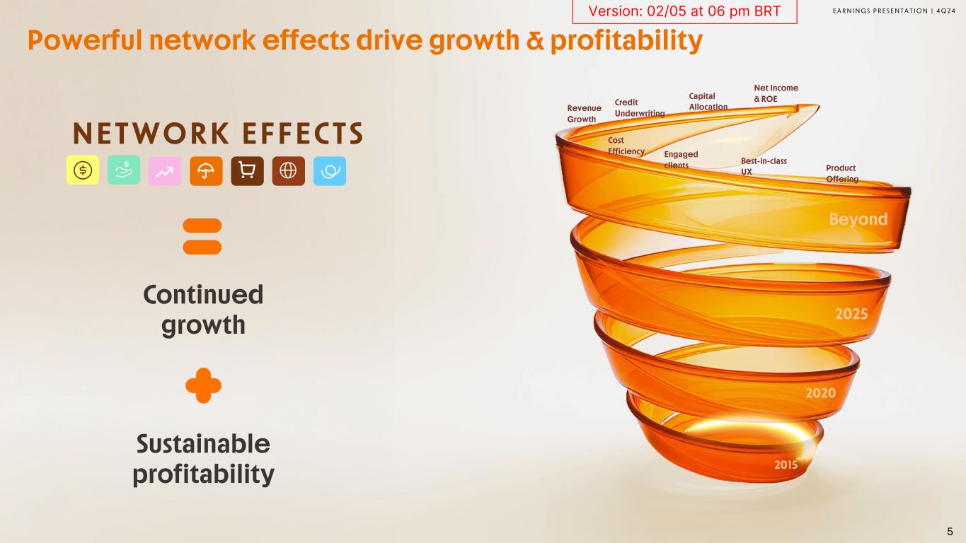 E A R N I N G S P R E S E N T A T I O N | 4 Q 2 4 5 Sustainable profitability Continued growth NETWORK EFFECTS Engaged clients Best-in-class UX Product Offering Cost Efficiency Revenue Growth Credit Underwriting Capital Allocation Net Income & ROE 2015 2020 2025 Beyond Version: 02/05 at 06 pm BRT Powerful network effects drive growth & profitability