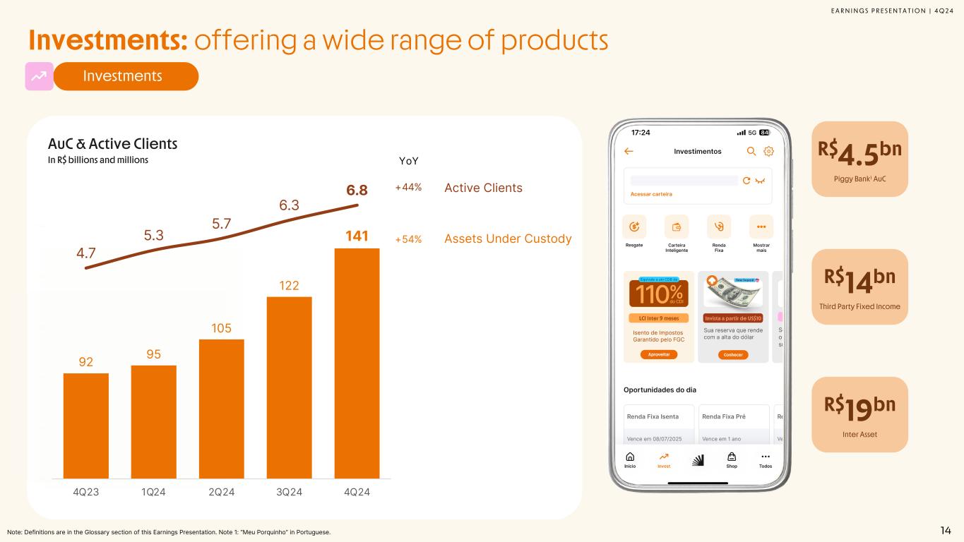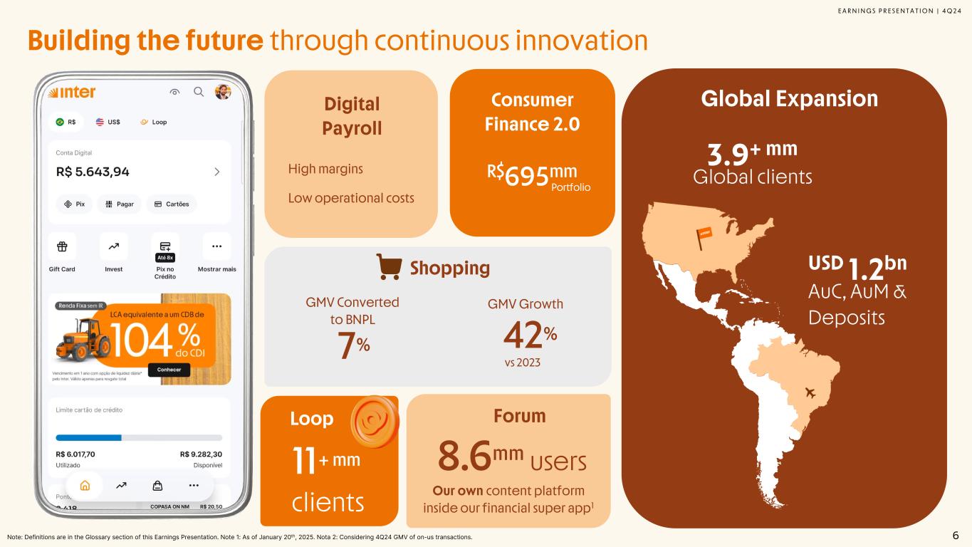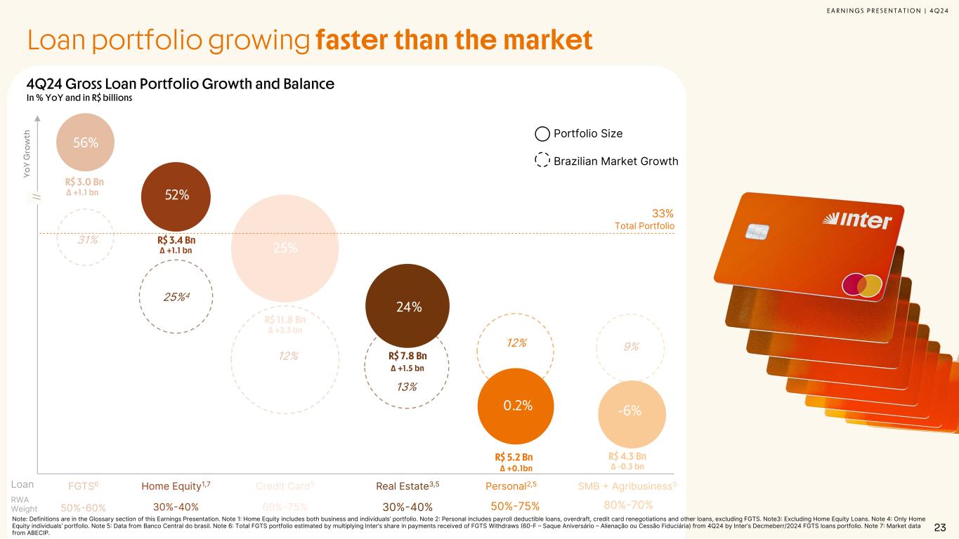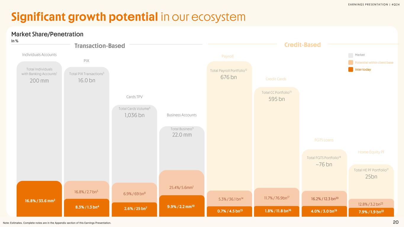 E A R N I N G S P R E S E N T A T I O N | 4 Q 2 4 Total Individuals with Banking Accounts1 200 mm Total PIX Transactions3 16.0 bn Total Cards Volume6 1,036 bn Total Business9 22.0 mm Total Payroll Portfolio12 676 bn Total CC Portfolio15 595 bn Total FGTS Portfolio18 ~76 bn Total HE PF Portfolio21 25bn Significant growth potential in our ecosystem Market Share/Penetration In % Transaction-Based Individuals Accounts Business Accounts PIX Cards TPV Payroll Credit Cards FGTS Loans Home Equity PF Credit-Based Potential within client base Inter today Market 25.4%/ 5.6mm1 16.8% / 2.7 bn5 6.9% / 69 bn8 5.3% / 36.1 bn14 11.7% / 76.9bn17 16.2% / 12.3 bn20 12.8% / 3.2 bn23 16.8% / 33.6 mm2 8.3% / 1.3 bn4 2.6% / 25 bn7 9.9% / 2.2 mm10 0.7% / 4.5 bn13 1.8% / 11.8 bn16 4.0% / 3.0 bn19 7.9% / 1.9 bn22 20Note: Estimates. Complete notes are in the Appendix section of this Earnings Presentation.
