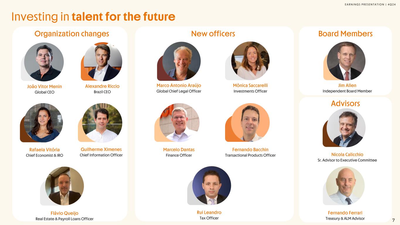 E A R N I N G S P R E S E N T A T I O N | 4 Q 2 4 Global Expansion 3.9+ mm Global clients USD 1.2bn AuC, AuM & Deposits Building the future through continuous innovation Note: Definitions are in the Glossary section of this Earnings Presentation. Note 1: As of January 20th, 2025. Nota 2: Considering 4Q24 GMV of on-us transactions. 6 Shopping 7% GMV Converted to BNPL 42% GMV Growth vs 2023 Forum Our own content platform inside our financial super app1 8.6mm users Consumer Finance 2.0 R$695mm Portfolio Digital Payroll High margins Low operational costs Loop 11+ mm clients