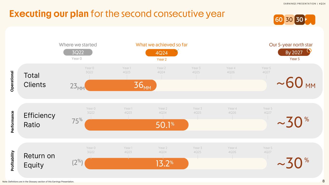 E A R N I N G S P R E S E N T A T I O N | 4 Q 2 4 0 1 2 3 4 5 6 Total Clients What we achieved so far 4Q24 Our 5-year north star By 2027 Where we started Year 5 O pe ra ti o na l Efficiency Ratio Pe rf o rm an ce Return on Equity Pr o fit ab ili ty Note: Definitions are in the Glossary section of this Earnings Presentation. Executing our plan for the second consecutive year 3Q22 MM~60 Year 2 Year 1 4Q23 Year 2 4Q24 Year 3 4Q25 Year 4 4Q26 Year 0 3Q22 Year 5 4Q27 Year 0 Year 1 4Q23 Year 2 4Q24 Year 3 4Q25 Year 4 4Q26 Year 0 3Q22 Year 5 4Q27 Year 1 4Q23 Year 2 4Q24 Year 3 4Q25 Year 4 4Q26 Year 0 3Q22 Year 5 4Q27 ~30% 8 ~30% 50.1% 13.2% 36MM 75% (2%) 23MM