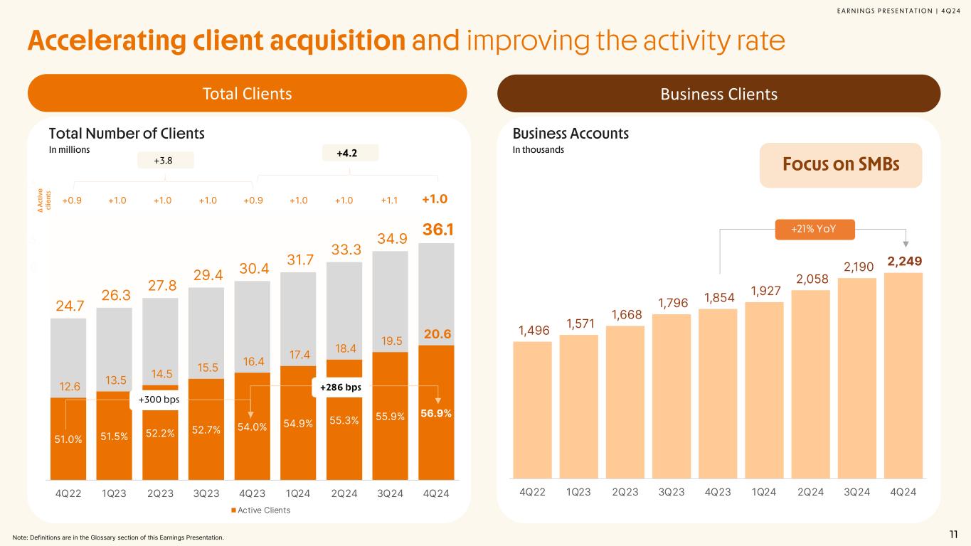 E A R N I N G S P R E S E N T A T I O N | 4 Q 2 4 +21% YoY 11 Total Clients 51.0% 51.5% 52.2% 52.7% 54.0% 54.9% 55.3% 55.9% 56.9% 12.6 13.5 14.5 15.5 16.4 17.4 18.4 19.5 20.6 24.7 26.3 27.8 29.4 30.4 31.7 33.3 34.9 36.1 - 5 .0 1 0. 1 5.0 2 0. 2 5.0 3 0. 3 5.0 4Q22 1Q23 2Q23 3Q23 4Q23 1Q24 2Q24 3Q24 4Q24 Active Clients +0.9 +1.0 +1.0 +1.0 +0.9 +1.0 +1.0 +1.1 +1.0 0 0.5 1 1.5 Δ A ct iv e cl ie nt s +300 bps +286 bps Total Number of Clients In millions Business Clients Business Accounts In thousands 1,496 1,571 1,668 1,796 1,854 1,927 2,058 2,190 2,249 1 5 0 1 1 ,0 01 1 ,5 01 2 ,0 0 1 2 ,5 01 4Q22 1Q23 2Q23 3Q23 4Q23 1Q24 2Q24 3Q24 4Q24 Focus on SMBs Accelerating client acquisition and improving the activity rate Note: Definitions are in the Glossary section of this Earnings Presentation. +3.8 +4.2