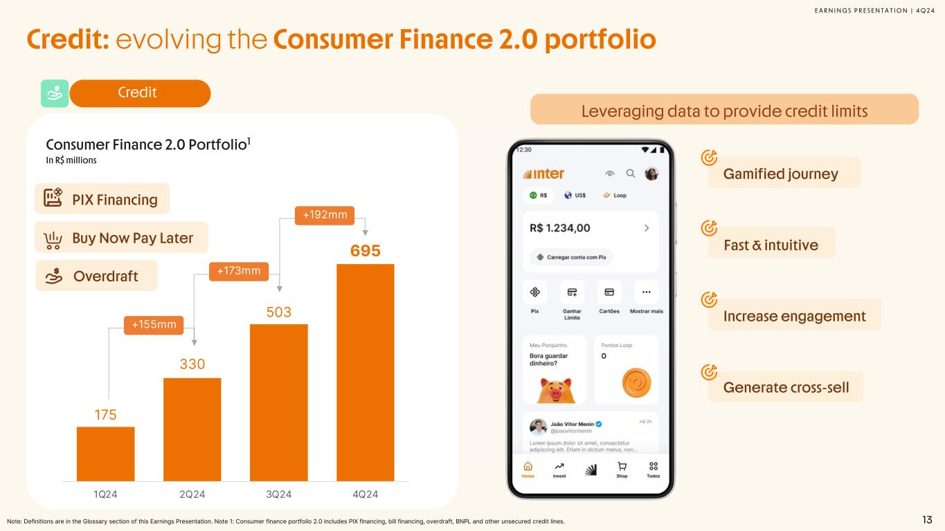 E A R N I N G S P R E S E N T A T I O N | 4 Q 2 4 Banking Cards + PIX TPV per Active Client In R$ thousand, monthly Cards + PIX TPV1 In R$ billions Note: Definitions are in the Glossary section of this Earnings Presentation. Note 1: Scale of PIX volume was reduced to fit on page. 12 %YoY +44% +13% +20%11.7 11.9 12.3 12.9 14.1 12.2 11.3 12.0 12.6 13.7 230 234 266 294 337 253 257 290 320 364 - 1 0. 0 2 0 .0 3 0 .0 4 0 .0 5 0 .0 6 0 .0 7 0 .0 8 0 .0 9 0 .0 4Q23 1Q24 2Q24 3Q24 4Q24 Credit Debit Pix Quarters of relationship 8.3% (+14 bps QoQ) PIX transactions Market Share Banking: Robust growth in TPV improving across cohorts R$ 1.5 trillion 4Q24 Run Rate 30.3 39.8 51.2 36.2 43.3 49.6 512 768 1,131 578 851 1,231 - 5 0 .0 1 0 .0 1 50 .0 2 0 0. 0 2 50 .0 3 0 0. 0 3 50 .0 2022 2023 2024 %YoY +45% +47% +14% +29% 0 2 4 6 8 10 1 3 5 7 9 11 13 15 17 19 21 23 25 27 Th ou sa nd s 4Q24 1Q18 +47%