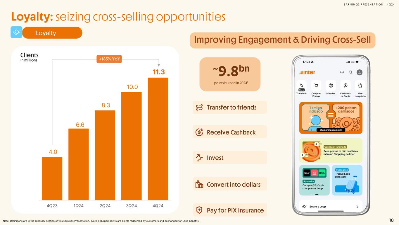 E A R N I N G S P R E S E N T A T I O N | 4 Q 2 4 Loyalty Note: Definitions are in the Glossary section of this Earnings Presentation. Note 1: Burned points are points redeemed by customers and exchanged for Loop benefits. Loyalty: seizing cross-selling opportunities Clients In millions 4.0 6.6 8.3 10.0 11.3 0 .0 2 .0 4 .0 6 .0 8 .0 10 .0 12 .0 4Q23 1Q24 2Q24 3Q24 4Q24 18 +183% YoY Invest Convert into dollars Pay for PIX Insurance Receive Cashback Transfer to friends Improving Engagement & Driving Cross-Sell ~9.8bn points burned in 20241