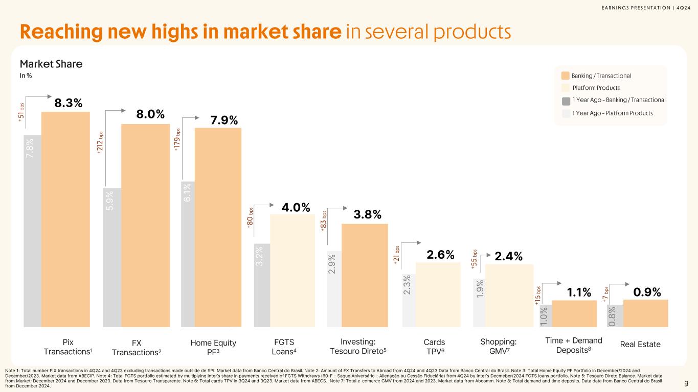E A R N I N G S P R E S E N T A T I O N | 4 Q 2 4 Market Share In % 7. 8% 5. 9% 1.9 % 6. 1% 2. 9% 2. 3% 3. 2% 1. 0% 0. 8% 19 2.4% 8.3% 8.0% 7.9% 3.8%4.0% 2.6% 1.1% 0.9% + 51 bp s + 55 bp s + 21 2 b p s + 17 9 b p s + 80 bp s + 83 bp s + 21 bp s + 15 bp s + 7 b p s Reaching new highs in market share in several products Note 1: Total number PIX transactions in 4Q24 and 4Q23 excluding transactions made outside de SPI. Market data from Banco Central do Brasil. Note 2: Amount of FX Transfers to Abroad from 4Q24 and 4Q23 Data from Banco Central do Brasil. Note 3: Total Home Equity PF Portfolio in December/2024 and December/2023. Market data from ABECIP. Note 4: Total FGTS portfolio estimated by multiplying Inter’s share in payments received of FGTS Withdraws (60-F – Saque Aniversário – Alienação ou Cessão Fiduciária) from 4Q24 by Inter’s Decmeber/2024 FGTS loans portfolio. Note 5: Tesouro Direto Balance. Market data from Market: December 2024 and December 2023. Data from Tesouro Transparente. Note 6: Total cards TPV in 3Q24 and 3Q23. Market data from ABECS. Note 7: Total e-comerce GMV from 2024 and 2023. Market data from Abcomm. Note 8: Total demand and time deposits. Data data from Banco Central do Brasil from December 2024. Pix Transactions1 FX Transactions2 Shopping: GMV7 Home Equity PF3 Investing: Tesouro Direto5 Cards TPV6 FGTS Loans4 Time + Demand Deposits8 Real Estate Banking / Transactional Platform Products 1 Year Ago – Banking / Transactional 1 Year Ago – Platform Products