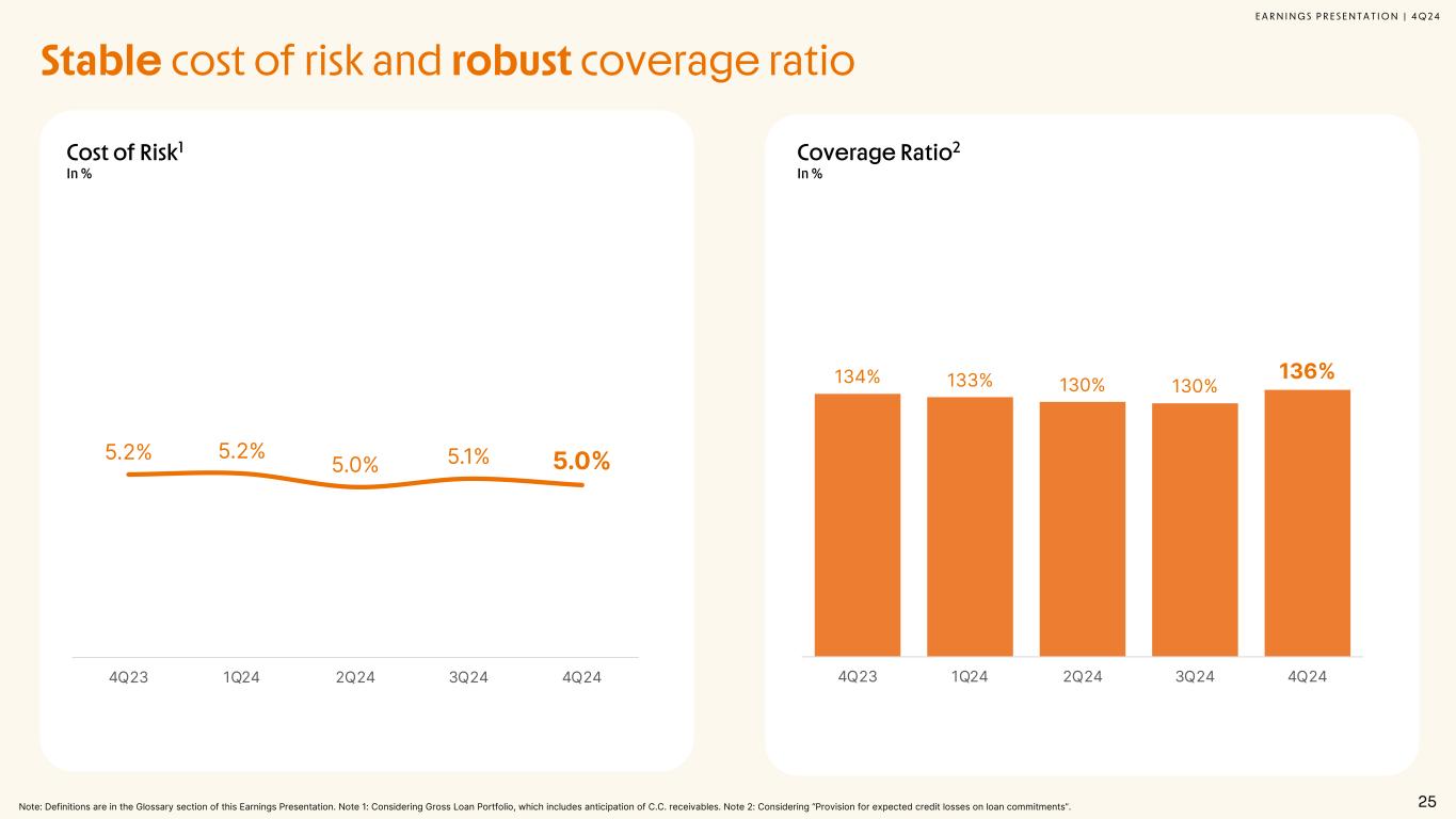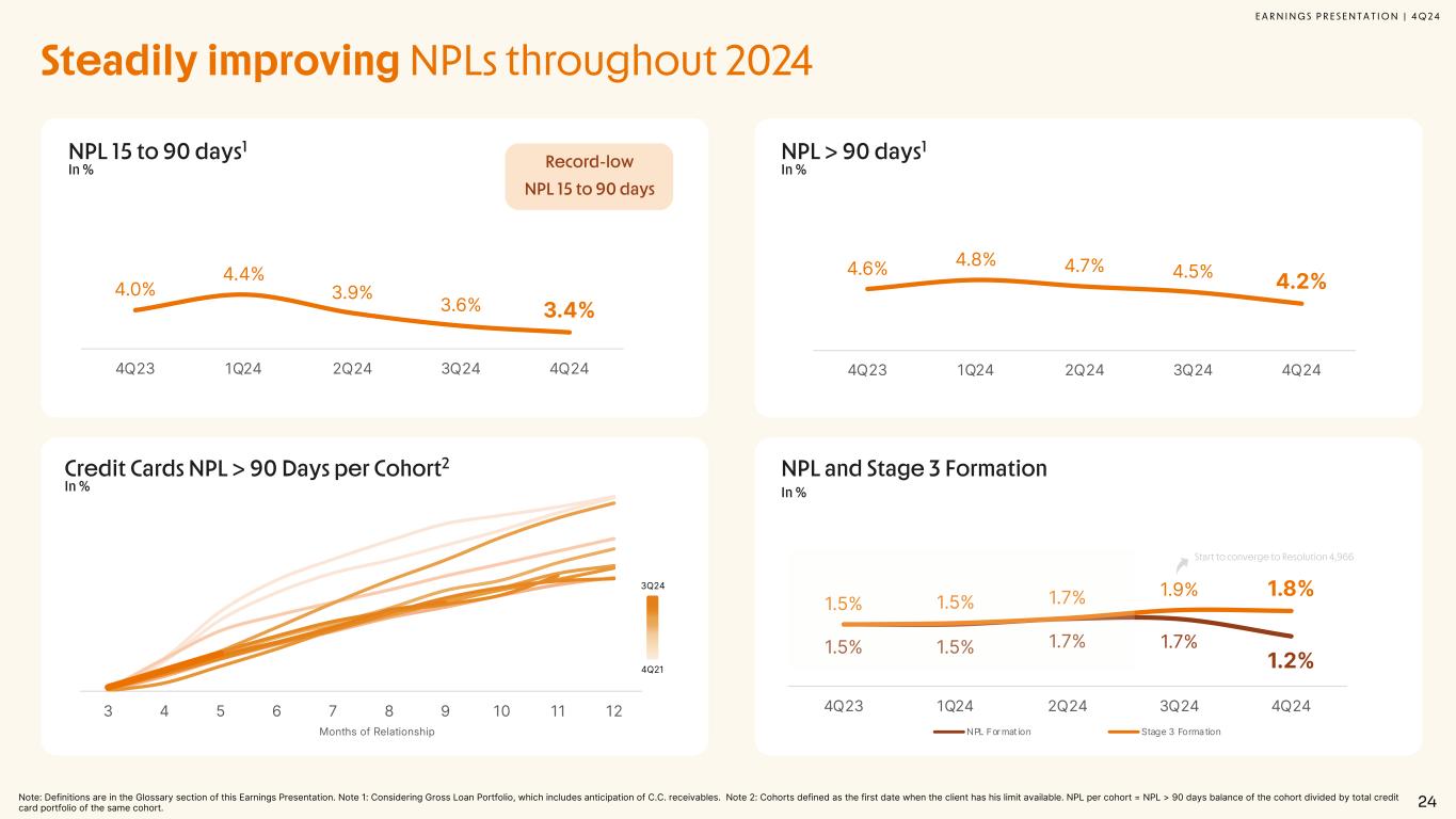E A R N I N G S P R E S E N T A T I O N | 4 Q 2 4 3 4 5 6 7 8 9 10 11 12 NPL > 90 days1 In % Credit Cards NPL > 90 Days per Cohort2 In % NPL 15 to 90 days1 In % NPL and Stage 3 Formation In % Note: Definitions are in the Glossary section of this Earnings Presentation. Note 1: Considering Gross Loan Portfolio, which includes anticipation of C.C. receivables. Note 2: Cohorts defined as the first date when the client has his limit available. NPL per cohort = NPL > 90 days balance of the cohort divided by total credit card portfolio of the same cohort. 3Q24 4Q21 24 4.6% 4.8% 4.7% 4.5% 4.2% 3 .0 % 3 .5 % 4 .0 % 4 .5 % 5 .0 % 5 .5 % 6 .0 % 6 .5 % 7 .0 % 4Q23 1Q24 2Q24 3Q24 4Q24 1.5% 1.5% 1.7% 1.7% 1.2% 1.5% 1.5% 1.7% 1.9% 1.8% 0 .0 % 0 .5 % 1. 0% 1. 5% 2 .0 % 2 .5 % 3 .0 % 3 .5 % 4 .0 % 4Q23 1Q24 2Q24 3Q24 4Q24 NPL Format ion Stage 3 Formation 4.0% 4.4% 3.9% 3.6% 3.4% 3 .0 % 3 .5 % 4 .0 % 4 .5 % 5 .0 % 5 .5 % 6 .0 % 6 .5 % 7 .0 % 4Q23 1Q24 2Q24 3Q24 4Q24 Start to converge to Resolution 4,966 Months of Relationship Record-low NPL 15 to 90 days Steadily improving NPLs throughout 2024