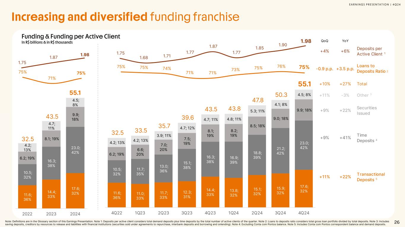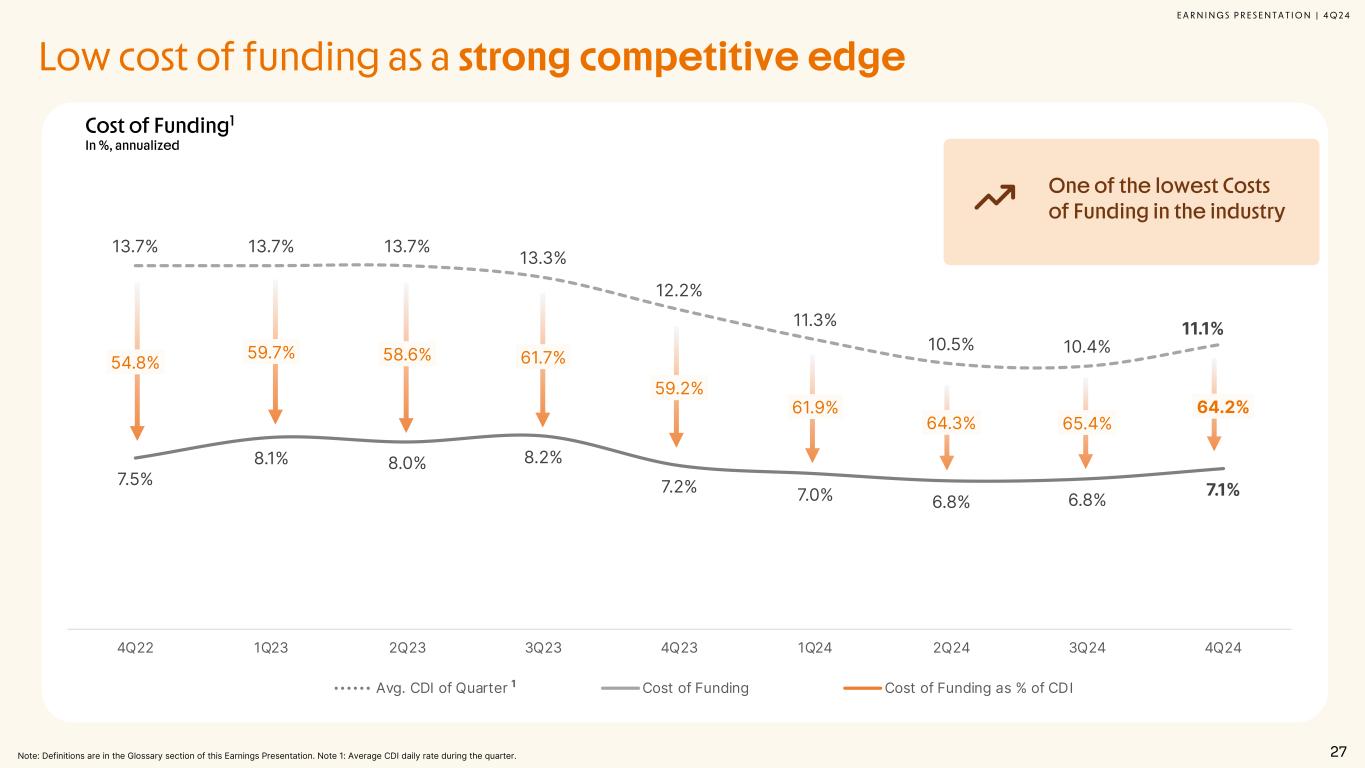 E A R N I N G S P R E S E N T A T I O N | 4 Q 2 4 26 QoQ YoY +4% +6% Deposits per Active Client -0.9 p.p. +3.5 p.p. Loans to Deposits Ratio +10% +27% Total +11% -3% Other +9% +22% Securities Issued +9% +41% Time Deposits +11% +22% Transactional Deposits 11.6; 36% 11.0; 33% 11.7; 33% 12.3; 31% 14.4; 33% 13.8; 32% 15.1; 32% 15.9; 32% 17.6; 32% 10.5; 32% 11.7; 35% 13.0; 36% 15.1; 38% 16.3; 38% 16.9; 39% 18.8; 39% 21.2; 42% 23.0; 42% 6.2; 19% 6.6; 20% 7.0; 20% 7.5; 19% 8.1; 19% 8.2; 19% 8.5; 18% 9.0; 18% 9.9; 18% 4.2; 13% 4.2; 13% 3.9; 11% 4.7; 12% 4.7; 11% 4.8; 11% 5.3; 11% 4.1; 8% 4.5; 8% 32.5 33.5 35.7 39.6 43.5 43.8 47.8 50.3 55.1 4Q22 1Q23 2Q23 3Q23 4Q23 1Q24 2Q24 3Q24 4Q24 1.75 1.68 1.71 1.77 1.87 1.77 1.85 1.90 1.98 1 .65 1 .70 1 .75 1 .80 1 .85 1 .90 1 .95 2 .0 75% 75% 74% 71% 71% 73% 75% 76% 75% 7 0% 7 2% 7 4% 7 6% 7 8% 8 0% Funding & Funding per Active Client In R$ billions & in R$ thousands Note: Definitions are in the Glossary section of this Earnings Presentation. Note 1: Deposits per active client considers total demand deposits plus time deposits by the total number of active clients of the quarter. Note 2: Loans to deposits ratio considers total gross loan portfolio divided by total deposits. Note 3: Includes saving deposits, creditors by resources to release and liabilities with financial institutions (securities sold under agreements to repurchase, interbank deposits and borrowing and onlending). Note 4: Excluding Conta com Pontos balance. Note 5: Includes Conta com Pontos correspondent balance and demand deposits. 3 4 5 1 2 Increasing and diversified funding franchise 11.6; 36% 14.4; 33% 17.6; 32% 10.5; 32% 16.3; 38% 23.0; 42% 6.2; 19% 8.1; 19% 9.9; 18% 4.2; 13% 4.7; 11% 4.5; 8% 32.5 43.5 55.1 2022 2023 2024 1.75 1.87 1.98 1 .65 1 .70 1 .75 1 .80 1 .85 1 .90 1 .95 2 .0 75% 71% 75% 7 0% 7 2% 7 4% 7 6% 7 8% 8 0%