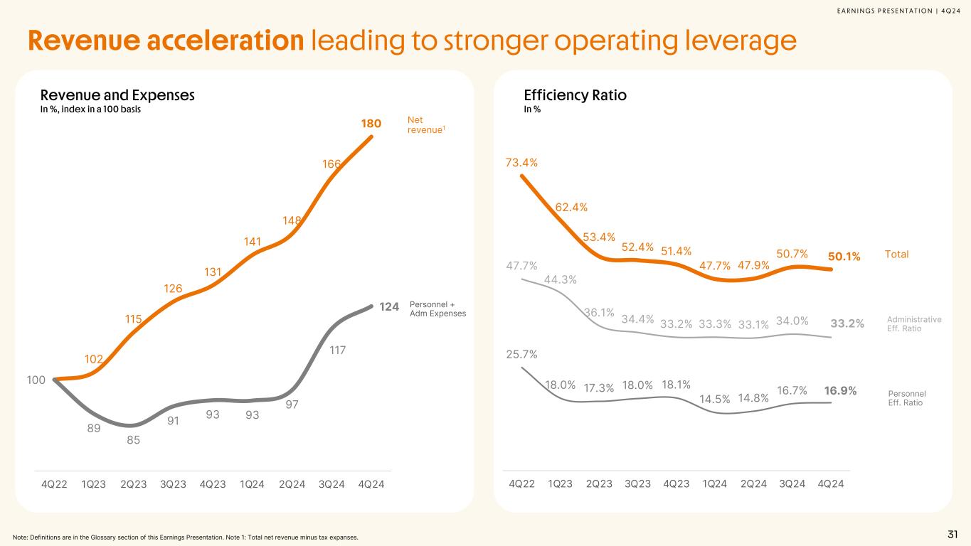 E A R N I N G S P R E S E N T A T I O N | 4 Q 2 4 Total Administrative Eff. Ratio 73.4% 62.4% 53.4% 52.4% 51.4% 47.7% 47.9% 50.7% 50.1% 25.7% 18.0% 17.3% 18.0% 18.1% 14.5% 14.8% 16.7% 16.9% 47.7% 44.3% 36.1% 34.4% 33.2% 33.3% 33.1% 34.0% 33.2% 0 0 .1 0 .2 0 .3 0 .4 0 .5 0 .6 0 .7 0 .8 0 .9 4Q22 1Q23 2Q23 3Q23 4Q23 1Q24 2Q24 3Q24 4Q24 Personnel + Adm Expenses Net revenue1 102 115 126 131 141 148 166 180 100 89 85 91 93 93 97 117 124 7 0 10 0 13 0 16 0 19 0 4Q22 1Q23 2Q23 3Q23 4Q23 1Q24 2Q24 3Q24 4Q24 31Note: Definitions are in the Glossary section of this Earnings Presentation. Note 1: Total net revenue minus tax expanses. Revenue acceleration leading to stronger operating leverage Efficiency Ratio In % Revenue and Expenses In %, index in a 100 basis Personnel Eff. Ratio