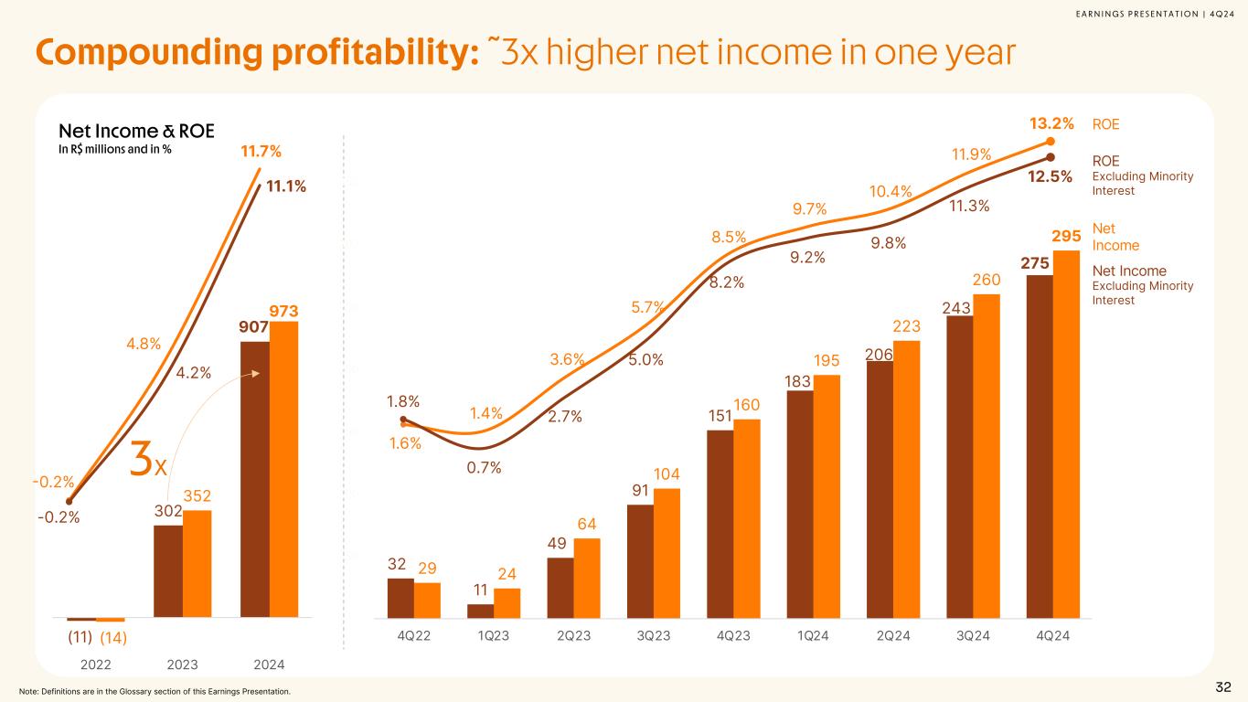 E A R N I N G S P R E S E N T A T I O N | 4 Q 2 4 Net Income & ROE In R$ millions and in % Net Income ROE Compounding profitability: ˜3x higher net income in one year 32 Net Income Excluding Minority Interest 1.6% 1.4% 3.6% 5.7% 8.5% 9.7% 10.4% 11.9% 13.2% 1.8% 0.7% 2.7% 5.0% 8.2% 9.2% 9.8% 11.3% 12.5% ROE Excluding Minority Interest Note: Definitions are in the Glossary section of this Earnings Presentation. -0.2% 4.8% 11.7% -0.2% 4.2% 11.1% 32 11 49 91 151 183 206 243 275 29 24 64 104 160 195 223 260 295 - 50 100 150 200 250 300 350 4Q22 1Q23 2Q23 3Q23 4Q23 1Q24 2Q24 3Q24 4Q24(11) 302 907 (14) 352 973 -10 0 10 0 30 0 50 0 70 0 90 0 2022 2023 2024 3X