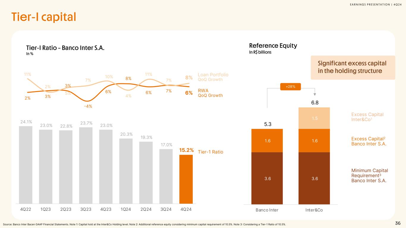E A R N I N G S P R E S E N T A T I O N | 4 Q 2 4 36 Tier-I capital 24.1% 23.0% 22.8% 23.7% 23.0% 20.3% 19.3% 17.0% 15.2% 0 .0 % 5 .0 % 10 .0 % 15 .0 % 2 0. 0% 2 5. 0% 3 0. 0% 4Q22 1Q23 2Q23 3Q23 4Q23 1Q24 2Q24 3Q24 4Q24 Tier-I Ratio – Banco Inter S.A. In % 2% 3% 3% -4% 6% 8% 6% 7% 6% 11% 2% 5% 7% 10% 4% 11% 7% 8% -6% -4% -2% 0% 2% 4% 6% 8% 10% 12% Loan Portfolio QoQ Growth RWA QoQ Growth Tier-1 Ratio Minimum Capital Requirement3 Banco Inter S.A. Excess Capital2 Banco Inter S.A. 3.6 3.6 1.6 1.6 1.5 5.3 6.8 - 1 .0 2 .0 3 .0 4 .0 5 .0 6 .0 7 .0 8 .0 Banco Inter Inter&Co Excess Capital Inter&Co1 +28% Reference Equity In R$ billions Significant excess capital in the holding structure Source: Banco Inter Bacen GAAP Financial Statements. Note 1: Capital hold at the Inter&Co Holding level. Note 2: Additional reference equity considering minimum capital requirement of 10.5%. Note 3: Considering a Tier-1 Ratio of 10.5%.