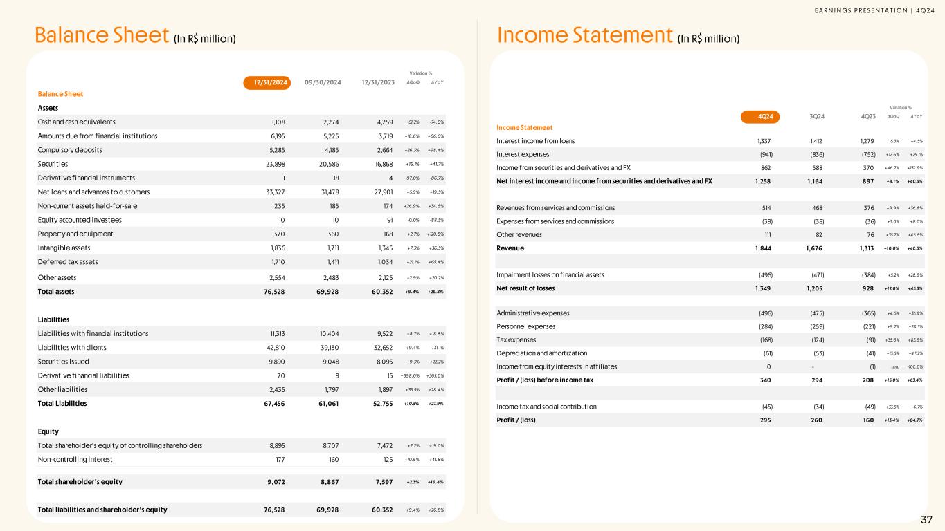 E A R N I N G S P R E S E N T A T I O N | 4 Q 2 4 Balance Sheet (In R$ million) Income Statement (In R$ million) 37 12/31/2024 09/30/2024 12/31/2023 ∆QoQ ∆YoY Balance Sheet Assets Cash and cash equivalents 1,108 2,274 4,259 -51.2% -74.0% Amounts due from financial institutions 6,195 5,225 3,719 +18.6% +66.6% Compulsory deposits 5,285 4,185 2,664 +26.3% +98.4% Securities 23,898 20,586 16,868 +16.1% +41.7% Derivative financial instruments 1 18 4 -97.0% -86.7% Net loans and advances to customers 33,327 31,478 27,901 +5.9% +19.5% Non-current assets held-for-sale 235 185 174 +26.9% +34.6% Equity accounted investees 10 10 91 -0.0% -88.5% Property and equipment 370 360 168 +2.7% +120.8% Intangible assets 1,836 1,711 1,345 +7.3% +36.5% Deferred tax assets 1,710 1,411 1,034 +21.1% +65.4% Variation % Other assets 2,554 2,483 2,125 +2.9% +20.2% Total assets 76,528 69,928 60,352 +9.4% +26.8% Liabilities Liabilities with financial institutions 11,313 10,404 9,522 +8.7% +18.8% Liabilities with clients 42,810 39,130 32,652 +9.4% +31.1% Securities issued 9,890 9,048 8,095 +9.3% +22.2% Derivative financial liabilities 70 9 15 +698.0% +365.0% Other liabilities 2,435 1,797 1,897 +35.5% +28.4% Total Liabilities 67,456 61,061 52,755 +10.5% +27.9% Equity Total shareholder's equity of controlling shareholders 8,895 8,707 7,472 +2.2% +19.0% Non-controlling interest 177 160 125 +10.6% +41.8% Total shareholder's equity 9,072 8,867 7,597 +2.3% +19.4% Total liabilities and shareholder's equity 76,528 69,928 60,352 +9.4% +26.8% 4Q24 3Q24 4Q23 ∆QoQ ∆YoY Income Statement Interest income from loans 1,337 1,412 1,279 -5.3% +4.5% Interest expenses (941) (836) (752) +12.6% +25.1% Income from securities and derivatives and FX 862 588 370 +46.7% +132.9% Net interest income and income from securities and derivatives and FX 1,258 1,164 897 +8.1% +40.3% Revenues from services and commissions 514 468 376 +9.9% +36.8% Expenses from services and commissions (39) (38) (36) +3.0% +8.0% Other revenues 111 82 76 +35.7% +45.6% Revenue 1,844 1,676 1,313 +10.0% +40.5% Impairment losses on financial assets (496) (471) (384) +5.2% +28.9% Net result of losses 1,349 1,205 928 +12.0% +45.3% Variation % Administrative expenses (496) (475) (365) +4.5% +35.9% Personnel expenses (284) (259) (221) +9.7% +28.3% Tax expenses (168) (124) (91) +35.6% +83.9% Depreciation and amortization (61) (53) (41) +13.5% +47.2% Income from equity interests in affiliates 0 - (1) n.m. -100.0% Profit / (loss) before income tax 340 294 208 +15.8% +63.4% Income tax and social contribution (45) (34) (49) +33.5% -6.7% Profit / (loss) 295 260 160 +13.4% +84.7%