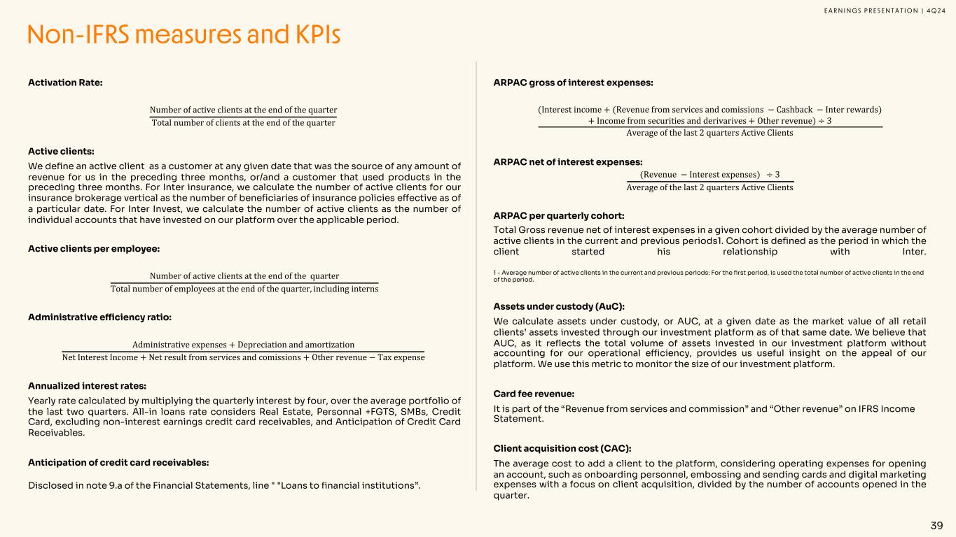 E A R N I N G S P R E S E N T A T I O N | 4 Q 2 4 39 Non-IFRS measures and KPIs Activation Rate: Number of active clients at the end of the quarter Total number of clients at the end of the quarter Active clients: We define an active client as a customer at any given date that was the source of any amount of revenue for us in the preceding three months, or/and a customer that used products in the preceding three months. For Inter insurance, we calculate the number of active clients for our insurance brokerage vertical as the number of beneficiaries of insurance policies effective as of a particular date. For Inter Invest, we calculate the number of active clients as the number of individual accounts that have invested on our platform over the applicable period. Active clients per employee: Number of active clients at the end of the quarter Total number of employees at the end of the quarter, including interns Administrative efficiency ratio: Administrative expenses + Depreciation and amortization Net Interest Income + Net result from services and comissions + Other revenue − Tax expense Annualized interest rates: Yearly rate calculated by multiplying the quarterly interest by four, over the average portfolio of the last two quarters. All-in loans rate considers Real Estate, Personnal +FGTS, SMBs, Credit Card, excluding non-interest earnings credit card receivables, and Anticipation of Credit Card Receivables. Anticipation of credit card receivables: Disclosed in note 9.a of the Financial Statements, line " "Loans to financial institutions”. ARPAC gross of interest expenses: (Interest income + (Revenue from services and comissions − Cashback − Inter rewards) + Income from securities and derivarives + Other revenue) ÷ 3 Average of the last 2 quarters Active Clients ARPAC net of interest expenses: (Revenue − Interest expenses) ÷ 3 Average of the last 2 quarters Active Clients ARPAC per quarterly cohort: Total Gross revenue net of interest expenses in a given cohort divided by the average number of active clients in the current and previous periods1. Cohort is defined as the period in which the client started his relationship with Inter. 1 - Average number of active clients in the current and previous periods: For the first period, is used the total number of active clients in the end of the period. Assets under custody (AuC): We calculate assets under custody, or AUC, at a given date as the market value of all retail clients’ assets invested through our investment platform as of that same date. We believe that AUC, as it reflects the total volume of assets invested in our investment platform without accounting for our operational efficiency, provides us useful insight on the appeal of our platform. We use this metric to monitor the size of our investment platform. Card fee revenue: It is part of the “Revenue from services and commission” and “Other revenue” on IFRS Income Statement. Client acquisition cost (CAC): The average cost to add a client to the platform, considering operating expenses for opening an account, such as onboarding personnel, embossing and sending cards and digital marketing expenses with a focus on client acquisition, divided by the number of accounts opened in the quarter.