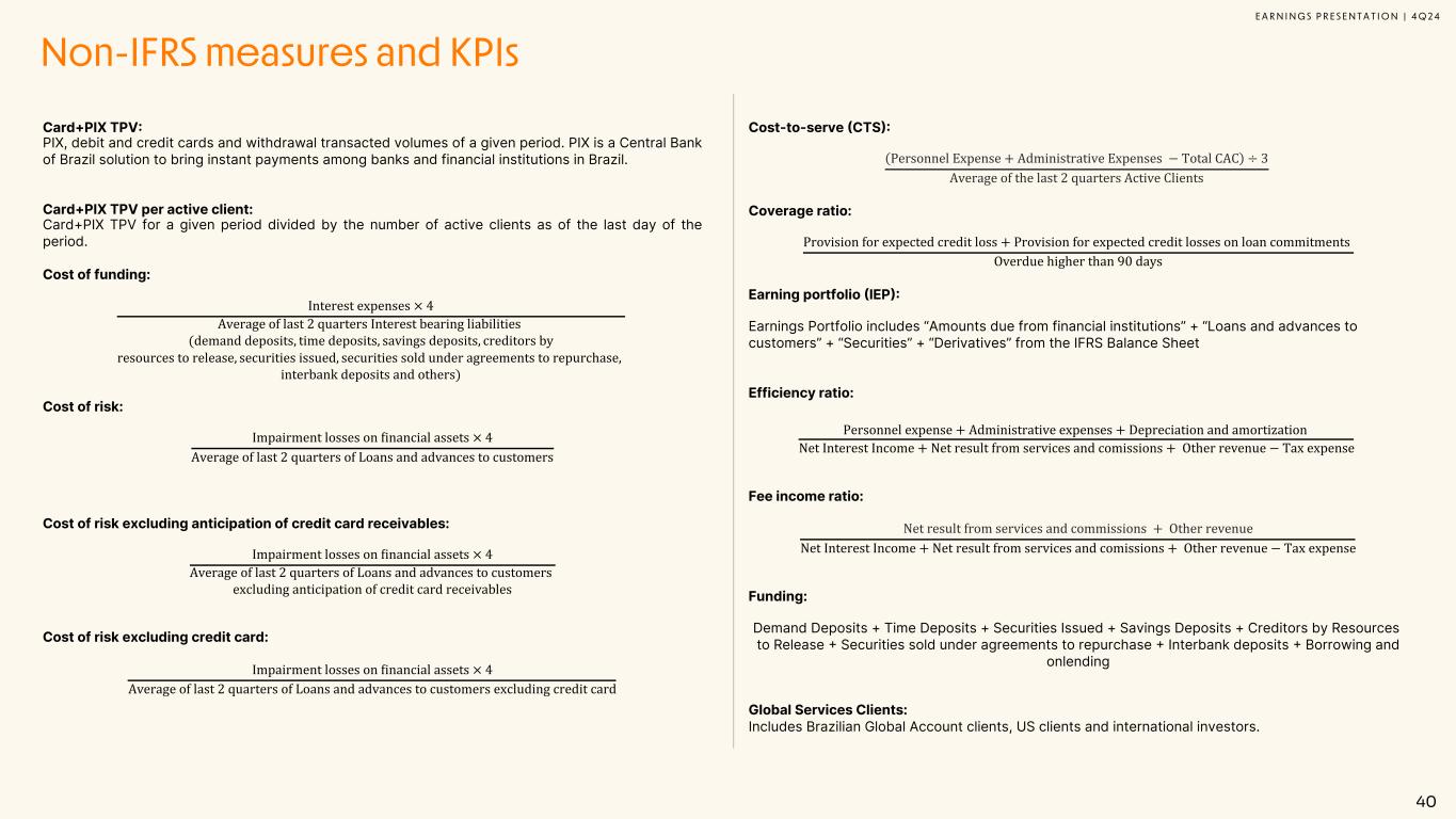 E A R N I N G S P R E S E N T A T I O N | 4 Q 2 4 40 Non-IFRS measures and KPIs Card+PIX TPV: PIX, debit and credit cards and withdrawal transacted volumes of a given period. PIX is a Central Bank of Brazil solution to bring instant payments among banks and financial institutions in Brazil. Card+PIX TPV per active client: Card+PIX TPV for a given period divided by the number of active clients as of the last day of the period. Cost of funding: Interest expenses × 4 Average of last 2 quarters Interest bearing liabilities (demand deposits, time deposits, savings deposits, creditors by resources to release, securities issued, securities sold under agreements to repurchase, interbank deposits and others) Cost of risk: Impairment losses on Minancial assets × 4 Average of last 2 quarters of Loans and advances to customers Cost of risk excluding anticipation of credit card receivables: Impairment losses on Minancial assets × 4 Average of last 2 quarters of Loans and advances to customers excluding anticipation of credit card receivables Cost of risk excluding credit card: Impairment losses on Minancial assets × 4 Average of last 2 quarters of Loans and advances to customers excluding credit card Cost-to-serve (CTS): Personnel Expense + Administrative Expenses − Total CAC ÷ 3 Average of the last 2 quarters Active Clients Coverage ratio: Provision for expected credit loss + Provision for expected credit losses on loan commitments Overdue higher than 90 days Earning portfolio (IEP): Earnings Portfolio includes “Amounts due from financial institutions” + “Loans and advances to customers” + “Securities” + “Derivatives” from the IFRS Balance Sheet Efficiency ratio: Personnel expense + Administrative expenses + Depreciation and amortization Net Interest Income + Net result from services and comissions + Other revenue − Tax expense Fee income ratio: Net result from services and commissions + Other revenue Net Interest Income + Net result from services and comissions + Other revenue − Tax expense Funding: Demand Deposits + Time Deposits + Securities Issued + Savings Deposits + Creditors by Resources to Release + Securities sold under agreements to repurchase + Interbank deposits + Borrowing and onlending Global Services Clients: Includes Brazilian Global Account clients, US clients and international investors.