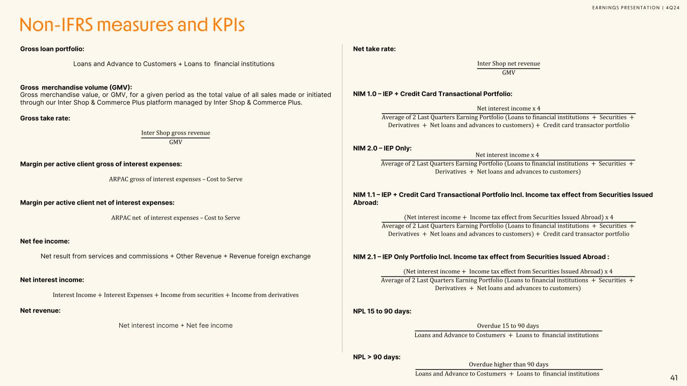E A R N I N G S P R E S E N T A T I O N | 4 Q 2 4 41 Non-IFRS measures and KPIs Gross loan portfolio: Loans and Advance to Customers + Loans to financial institutions Gross merchandise volume (GMV): Gross merchandise value, or GMV, for a given period as the total value of all sales made or initiated through our Inter Shop & Commerce Plus platform managed by Inter Shop & Commerce Plus. Gross take rate: Inter Shop gross revenue GMV Margin per active client gross of interest expenses: ARPAC gross of interest expenses – Cost to Serve Margin per active client net of interest expenses: ARPAC net of interest expenses – Cost to Serve Net fee income: Net result from services and commissions + Other Revenue + Revenue foreign exchange Net interest income: Interest Income + Interest Expenses + Income from securities + Income from derivatives Net revenue: Net interest income + Net fee income Net take rate: Inter Shop net revenue GMV NIM 1.0 – IEP + Credit Card Transactional Portfolio: Net interest income x 4 Average of 2 Last Quarters Earning Portfolio (Loans to Minancial institutions + Securities + Derivatives + Net loans and advances to customers) + Credit card transactor portfolio NIM 2.0 – IEP Only: Net interest income x 4 Average of 2 Last Quarters Earning Portfolio (Loans to Minancial institutions + Securities + Derivatives + Net loans and advances to customers) NIM 1.1 – IEP + Credit Card Transactional Portfolio Incl. Income tax effect from Securities Issued Abroad: (Net interest income + Income tax effect from Securities Issued Abroad) x 4 Average of 2 Last Quarters Earning Portfolio (Loans to Minancial institutions + Securities + Derivatives + Net loans and advances to customers) + Credit card transactor portfolio NIM 2.1 – IEP Only Portfolio Incl. Income tax effect from Securities Issued Abroad : (Net interest income + Income tax effect from Securities Issued Abroad) x 4 Average of 2 Last Quarters Earning Portfolio (Loans to Minancial institutions + Securities + Derivatives + Net loans and advances to customers) NPL 15 to 90 days: Overdue 15 to 90 days Loans and Advance to Costumers + Loans to Minancial institutions NPL > 90 days: Overdue higher than 90 days Loans and Advance to Costumers + Loans to Minancial institutions