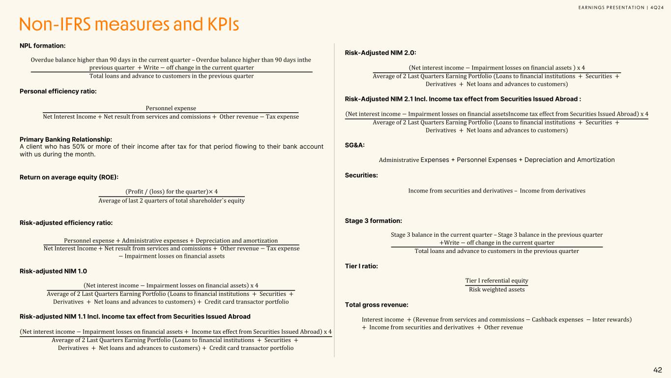 E A R N I N G S P R E S E N T A T I O N | 4 Q 2 4 42 Non-IFRS measures and KPIs Risk-Adjusted NIM 2.0: Net interest income − Impairment losses on Minancial assets x 4 Average of 2 Last Quarters Earning Portfolio (Loans to Minancial institutions + Securities + Derivatives + Net loans and advances to customers) Risk-Adjusted NIM 2.1 Incl. Income tax effect from Securities Issued Abroad : Net interest income − Impairment losses on Minancial assetsIncome tax effect from Securities Issued Abroad x 4 Average of 2 Last Quarters Earning Portfolio (Loans to Minancial institutions + Securities + Derivatives + Net loans and advances to customers) SG&A: Administrative Expenses + Personnel Expenses + Depreciation and Amortization Securities: Income from securities and derivatives – Income from derivatives Stage 3 formation: Stage 3 balance in the current quarter – Stage 3 balance in the previous quarter +Write − off change in the current quarter Total loans and advance to customers in the previous quarter Tier I ratio: Tier I referential equity Risk weighted assets Total gross revenue: Interest income + Revenue from services and commissions − Cashback expenses − Inter rewards + Income from securities and derivatives + Other revenue NPL formation: Overdue balance higher than 90 days in the current quarter – Overdue balance higher than 90 days inthe previous quarter + Write − off change in the current quarter Total loans and advance to customers in the previous quarter Personal efficiency ratio: Personnel expense Net Interest Income + Net result from services and comissions + Other revenue − Tax expense Primary Banking Relationship: A client who has 50% or more of their income after tax for that period flowing to their bank account with us during the month. Return on average equity (ROE): (ProMit / (loss) for the quarter)× 4 Average of last 2 quarters of total shareholder`s equity Risk-adjusted efficiency ratio: Personnel expense + Administrative expenses + Depreciation and amortization Net Interest Income + Net result from services and comissions + Other revenue − Tax expense − Impairment losses on Minancial assets Risk-adjusted NIM 1.0 Net interest income − Impairment losses on Minancial assets x 4 Average of 2 Last Quarters Earning Portfolio (Loans to Minancial institutions + Securities + Derivatives + Net loans and advances to customers) + Credit card transactor portfolio Risk-adjusted NIM 1.1 Incl. Income tax effect from Securities Issued Abroad Net interest income − Impairment losses on Minancial assets + Income tax effect from Securities Issued Abroad x 4 Average of 2 Last Quarters Earning Portfolio (Loans to Minancial institutions + Securities + Derivatives + Net loans and advances to customers) + Credit card transactor portfolio