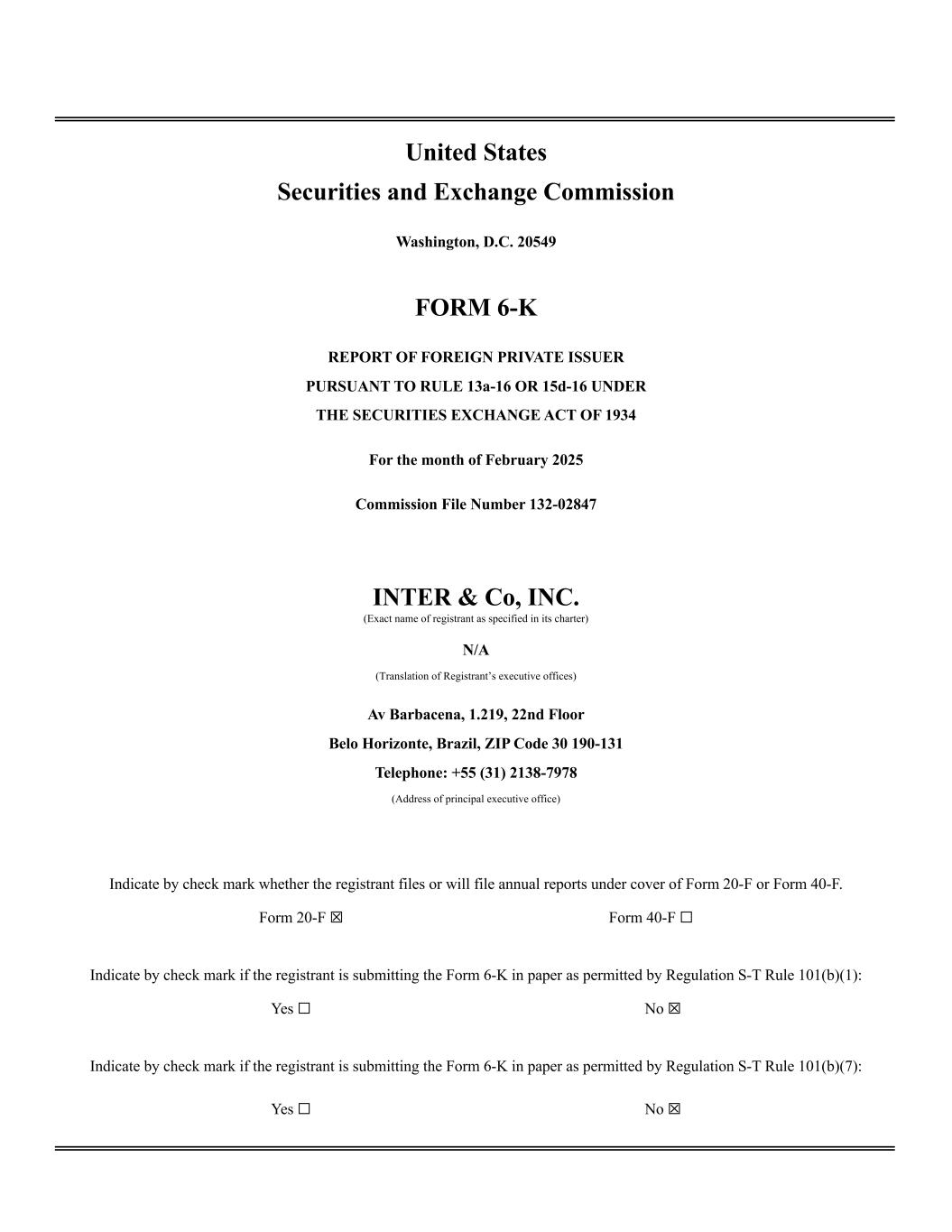 United States Securities and Exchange Commission Washington, D.C. 20549 FORM 6-K REPORT OF FOREIGN PRIVATE ISSUER PURSUANT TO RULE 13a-16 OR 15d-16 UNDER THE SECURITIES EXCHANGE ACT OF 1934 For the month of February 2025 Commission File Number 132-02847 INTER & Co, INC. (Exact name of registrant as specified in its charter) N/A (Translation of Registrant’s executive offices) Av Barbacena, 1.219, 22nd Floor Belo Horizonte, Brazil, ZIP Code 30 190-131 Telephone: +55 (31) 2138-7978 (Address of principal executive office) Indicate by check mark whether the registrant files or will file annual reports under cover of Form 20-F or Form 40-F. Form 20-F ☒ Form 40-F ☐ Indicate by check mark if the registrant is submitting the Form 6-K in paper as permitted by Regulation S-T Rule 101(b)(1): Yes ☐ No ☒ Indicate by check mark if the registrant is submitting the Form 6-K in paper as permitted by Regulation S-T Rule 101(b)(7): Yes ☐ No ☒