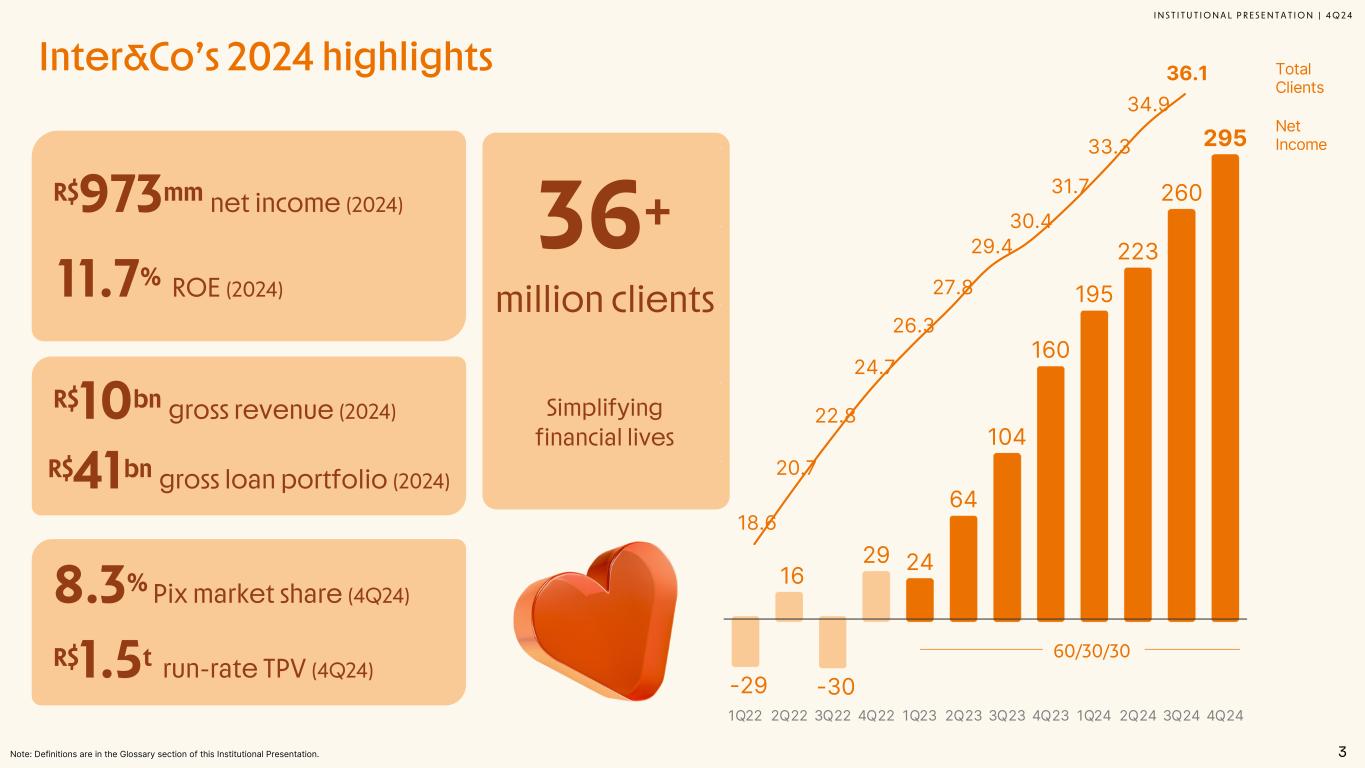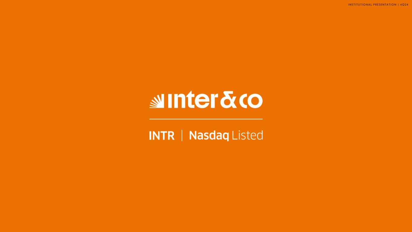 I N S T I T U T I O N A L P R E S E N T A T I O N | 4 Q 2 4 Disclaimer This report may contain forward-looking statements regarding Inter, anticipated synergies, growth plans, projected results and future strategies. While these forward-looking statements reflect our Management’s good faith beliefs, they involve known and unknown risks and uncertainties that could cause the company’s results or accrued results to differ materially from those anticipated and discussed herein. These statements are not guarantees of future performance. These risks and uncertainties include, but are not limited to, our ability to realize the amount of projected synergies and the projected schedule, in addition to economic, competitive, governmental and technological factors affecting Inter, the markets, products and prices and other factors. In addition, this presentation contains managerial numbers that may differ from those presented in our financial statements. The calculation methodology for these managerial numbers is presented in Inter’s quarterly earnings release. Statements contained in this report that are not fact or historical information may be forward-looking statements under the terms of the Private Securities Litigation Reform Act of 1995. These forward- looking statements may, among other things, beliefs related to the creation of value and any other statements regarding Inter. In some cases, terms such as “estimate”, “project”, “predict”, “plan”, “believe”, “can”, “expectation”, “anticipate”, “intend”, “aimed”, “potential”, “may”, “will/shall” and similar terms, or the negative of these expressions, may identify forward looking statements. These forward-looking statements are based on Inter's expectations and beliefs about future events and involve risks and uncertainties that could cause actual results to differ materially from current ones. Any forward-looking statement made by us in this document is based only on information currently available to us and speaks only as of the date on which it is made. We undertake no obligation to publicly update any forward-looking statement, whether written or oral, that may be made from time to time, whether as a result of new information, future developments or otherwise. For additional information that about factors that may lead to results that are different from our estimates, please refer to sections “Cautionary Statement Concerning Forward-Looking Statements” and “Risk Factors” of Inter&Co Annual Report on Form 20-F. The numbers for our key metrics (Unit Economics), which include active users, as average revenue per active client (ARPAC), cost to serve (CTS), are calculated using Inter’s internal data. Although we believe these metrics are based on reasonable estimates, there are challenges inherent in measuring the use of our business. In addition, we continually seek to improve our estimates, which may change due to improvements or changes in methodology, in processes for calculating these metrics and, from time to time, we may discover inaccuracies and make adjustments to improve accuracy, including adjustments that may result in recalculating our historical metrics. About Non-IFRS Financial Measures To supplement the financial measures presented in this press release and related conference call, presentation, or webcast in accordance with IFRS, Inter&Co also presents non-IFRS measures of financial performance, as highlighted throughout the documents. The non-IFRS Financial Measures include, among others: Adjusted Net Income, Cost to Serve, Cost of Funding, Efficiency Ratio, Underwriting, NPL > 90 days, NPL 15 to 90 days, NPL and Stage 3 Formation, Cost of Risk, Coverage Ratio, Funding, All-in Cost of Funding, Gross Merchandise Volume (GMV), Premium, Net Inflows, Global Services Deposits and Investments, Fee Income Ratio, Client Acquisition Cost, Cards+PIX TPV, Gross ARPAC, Net ARPAC, Marginal NIM 1.0, Marginal NIM 2.0, Net Interest Margin IEP + Non-int. CC Receivables (1.0), Net Interest Margin IEP (2.0), Cost-to-Serve, Risk-Adjusted Net Interest Margin IEP + Non-int. CC Receivables (1.0), Risk Adjusted Net Interest Margin IEP (2.0), Risk Adjusted Efficiency Ratio. A “non-IFRS financial measure” refers to a numerical measure of Inter&Co’s historical or financial position that either excludes or includes amounts that are not normally excluded or included in the most directly comparable measure calculated and presented in accordance with IFRS in Inter&Co’s financial statements. Inter&Co provides certain non-IFRS measures as additional information relating to its operating results as a complement to results provided in accordance with IFRS. The non-IFRS financial information presented herein should be considered together with, and not as a substitute for or superior to, the financial information presented in accordance with IFRS. There are significant limitations associated with the use of non-IFRS financial measures. Further, these measures may differ from the non-IFRS information, even where similarly titled, used by other companies and therefore should not be used to compare Inter&Co’s performance to that of other companies. 2