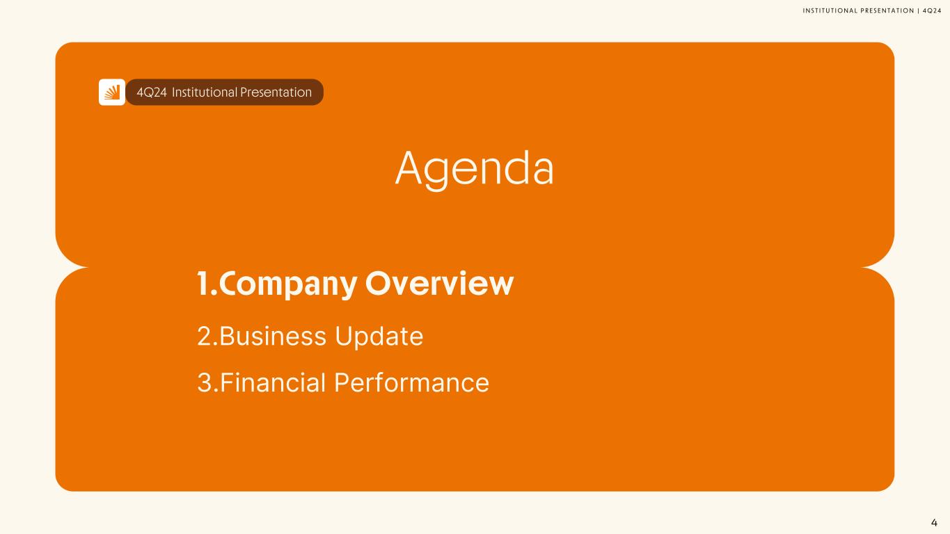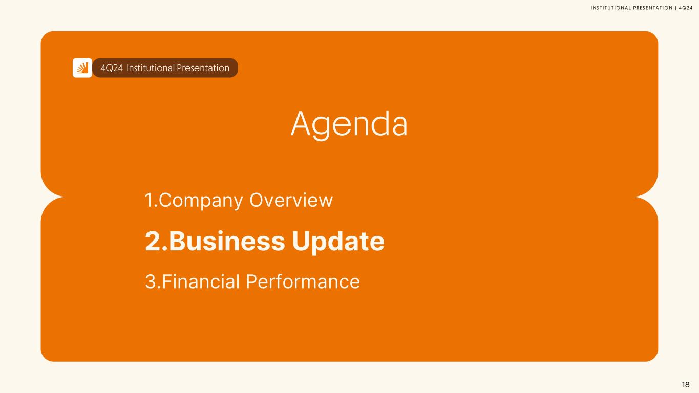 I N S T I T U T I O N A L P R E S E N T A T I O N | 4 Q 2 4 18 Agenda 1.Company Overview 2.Business Update 3.Financial Performance 4Q24 Institutional Presentation