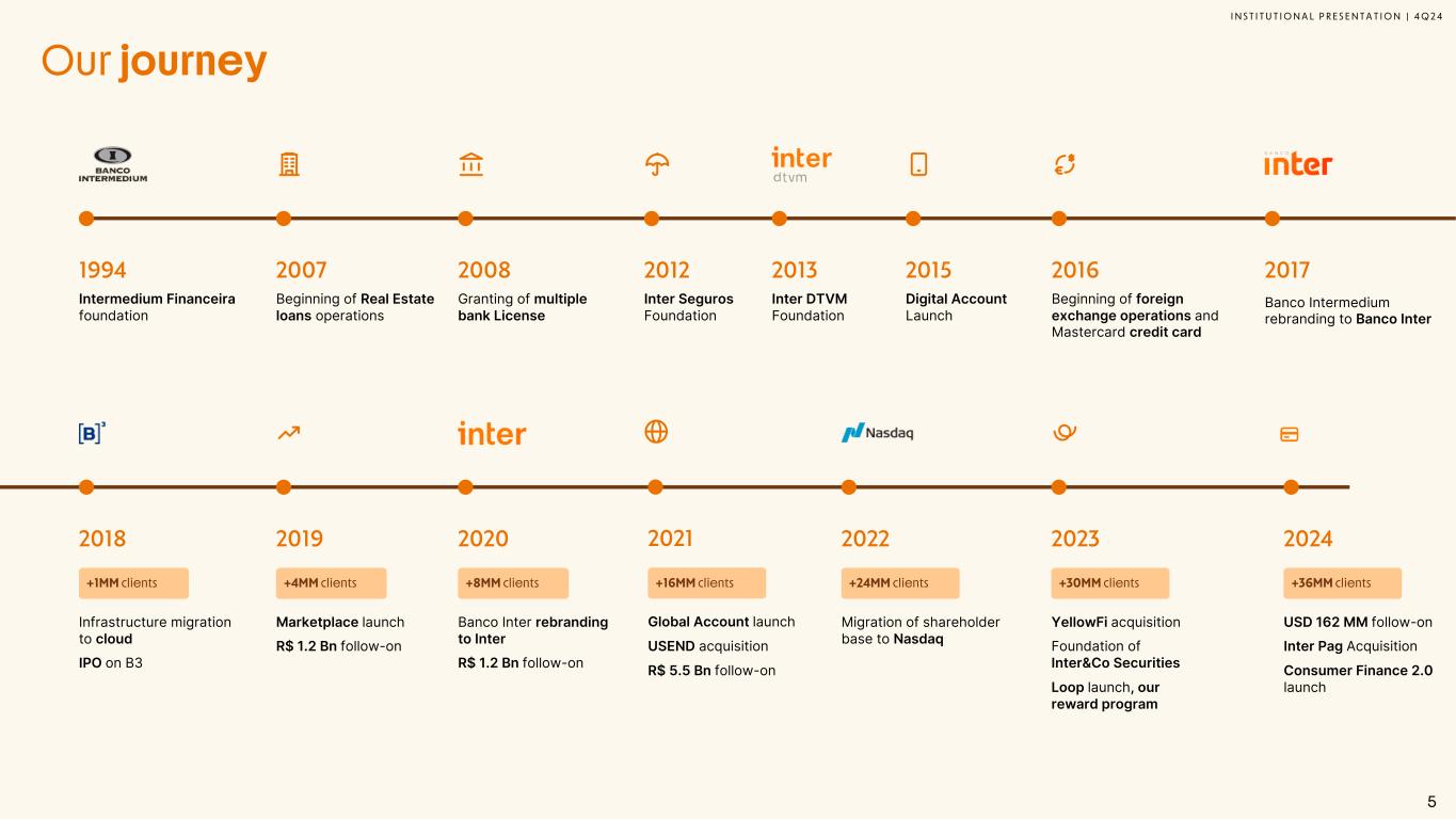 I N S T I T U T I O N A L P R E S E N T A T I O N | 4 Q 2 4 1994 Intermedium Financeira foundation 2007 Beginning of Real Estate loans operations 2008 Granting of multiple bank License 2012 Inter Seguros Foundation 2013 Inter DTVM Foundation 2015 Digital Account Launch 2016 Beginning of foreign exchange operations and Mastercard credit card 2017 Banco Intermedium rebranding to Banco Inter 2018 +1MM clients Infrastructure migration to cloud IPO on B3 2019 +4MM clients Marketplace launch R$ 1.2 Bn follow-on 2020 +8MM clients Banco Inter rebranding to Inter R$ 1.2 Bn follow-on 2021 +16MM clients Global Account launch USEND acquisition R$ 5.5 Bn follow-on 2022 +24MM clients Migration of shareholder base to Nasdaq 2023 +30MM clients YellowFi acquisition Foundation of Inter&Co Securities Loop launch, our reward program Our journey 2024 +36MM clients USD 162 MM follow-on Inter Pag Acquisition Consumer Finance 2.0 launch 5