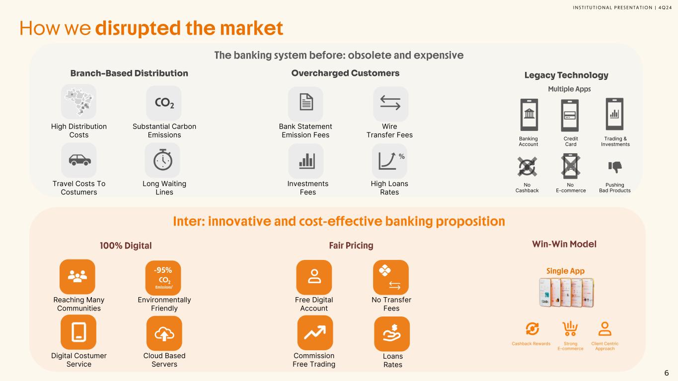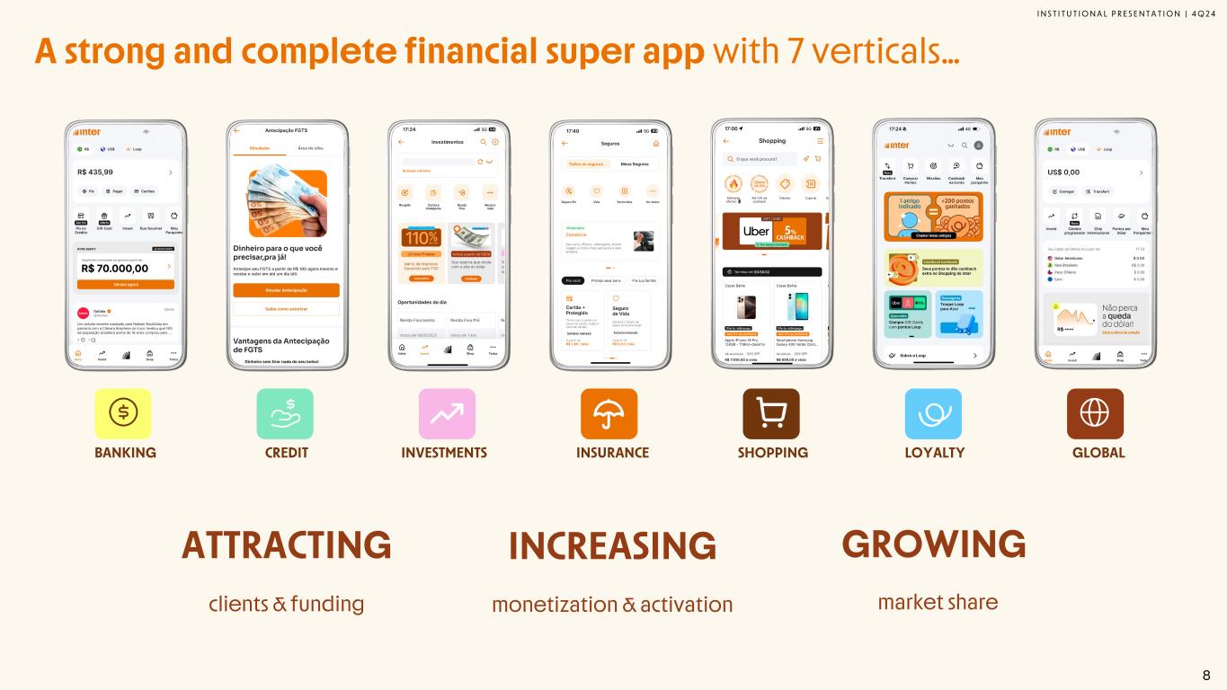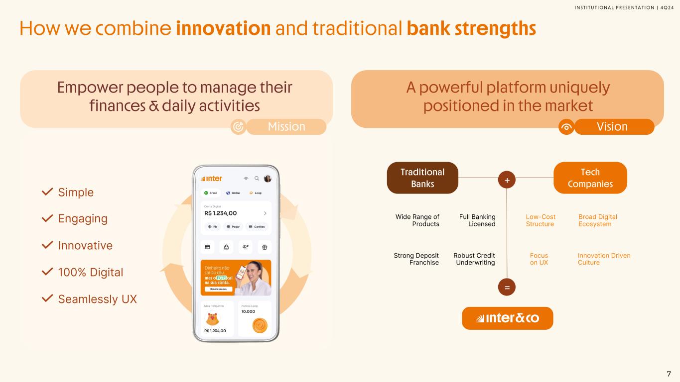 I N S T I T U T I O N A L P R E S E N T A T I O N | 4 Q 2 4 How we disrupted the market Credit Card Banking Account Trading & Investments Multiple Apps Branch-Based Distribution High Distribution Costs Travel Costs To Costumers Long Waiting Lines Substantial Carbon Emissions Overcharged Customers Bank Statement Emission Fees Investments Fees High Loans Rates Wire Transfer Fees Legacy Technology The banking system before: obsolete and expensive CO2 % Reaching Many Communities Digital Costumer Service Cloud Based Servers Environmentally Friendly Free Digital Account Commission Free Trading Loans Rates No Transfer Fees Single App Cashback Rewards Strong E-commerce Client Centric Approach -95% CO2 Emissions1 100% Digital Fair Pricing Win-Win Model Inter: innovative and cost-effective banking proposition No Cashback No E-commerce Pushing Bad Products 6