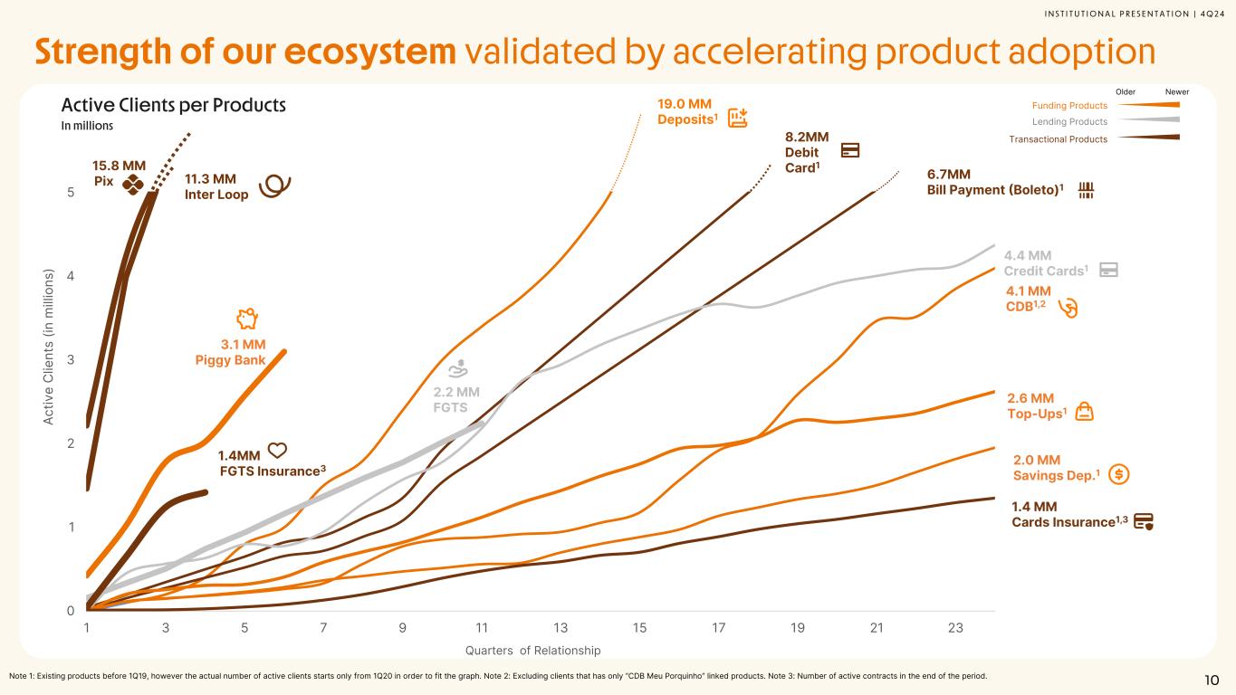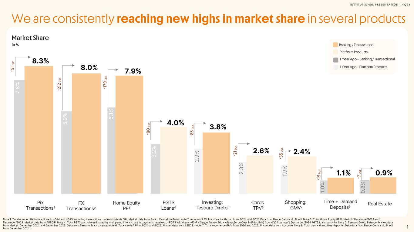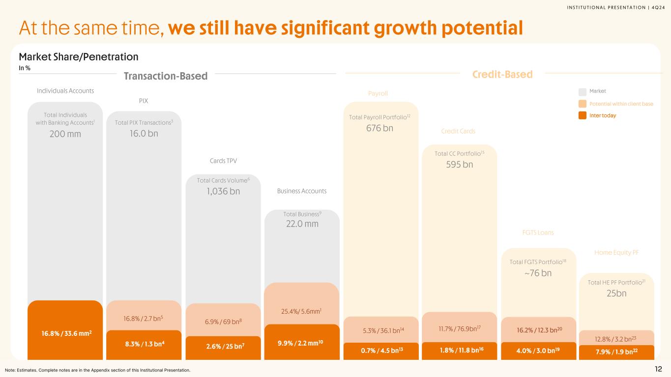 I N S T I T U T I O N A L P R E S E N T A T I O N | 4 Q 2 4 Total Individuals with Banking Accounts1 200 mm Total PIX Transactions3 16.0 bn Total Cards Volume6 1,036 bn Total Business9 22.0 mm Total Payroll Portfolio12 676 bn Total CC Portfolio15 595 bn Total FGTS Portfolio18 ~76 bn Total HE PF Portfolio21 25bn At the same time, we still have significant growth potential Market Share/Penetration In % Transaction-Based Individuals Accounts Business Accounts PIX Cards TPV Payroll Credit Cards FGTS Loans Home Equity PF Credit-Based Potential within client base Inter today Market 25.4%/ 5.6mm1 16.8% / 2.7 bn5 6.9% / 69 bn8 5.3% / 36.1 bn14 11.7% / 76.9bn17 16.2% / 12.3 bn20 12.8% / 3.2 bn23 16.8% / 33.6 mm2 8.3% / 1.3 bn4 2.6% / 25 bn7 9.9% / 2.2 mm10 0.7% / 4.5 bn13 1.8% / 11.8 bn16 4.0% / 3.0 bn19 7.9% / 1.9 bn22 12Note: Estimates. Complete notes are in the Appendix section of this Institutional Presentation.