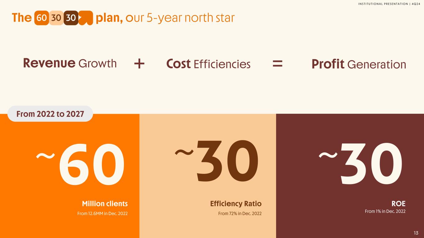 I N S T I T U T I O N A L P R E S E N T A T I O N | 4 Q 2 4 Total Clients What we achieved so far 4Q24 Our 5-year north star By 2027 Where we started Year 5 O pe ra ti o na l Efficiency Ratio Pe rf o rm an ce Return on Equity Pr o fit ab ili ty Note: Definitions are in the Glossary section of this Institutional Presentation. How’s the execution so far 3Q22 MM~60 Year 2 Year 1 4Q23 Year 2 4Q24 Year 3 4Q25 Year 4 4Q26 Year 0 3Q22 Year 5 4Q27 Year 0 Year 1 4Q23 Year 2 4Q24 Year 3 4Q25 Year 4 4Q26 Year 0 3Q22 Year 5 4Q27 Year 1 4Q23 Year 2 4Q24 Year 3 4Q25 Year 4 4Q26 Year 0 3Q22 Year 5 4Q27 ~30% 14 ~30 % 50.1% 13.2% 36MM 75% (2%) 23MM