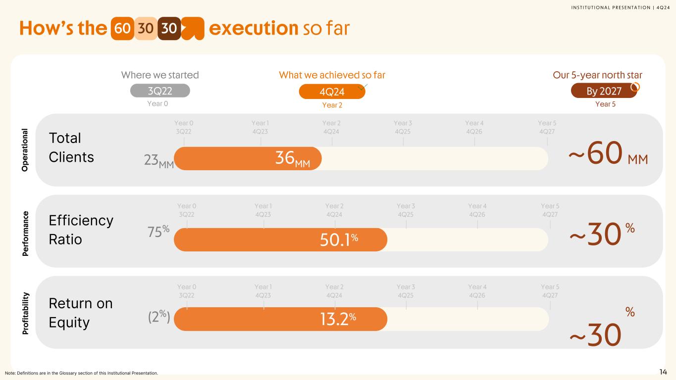 13 I N S T I T U T I O N A L P R E S E N T A T I O N | 4 Q 2 4 ~60 ~30 ~30 Million clients From 12.6MM in Dec. 2022 Efficiency Ratio From 72% in Dec. 2022 ROE From 1% in Dec. 2022 The plan, our 5-year north star 13 From 2022 to 2027 =Revenue Growth Cost Efficiencies Profit Generation+