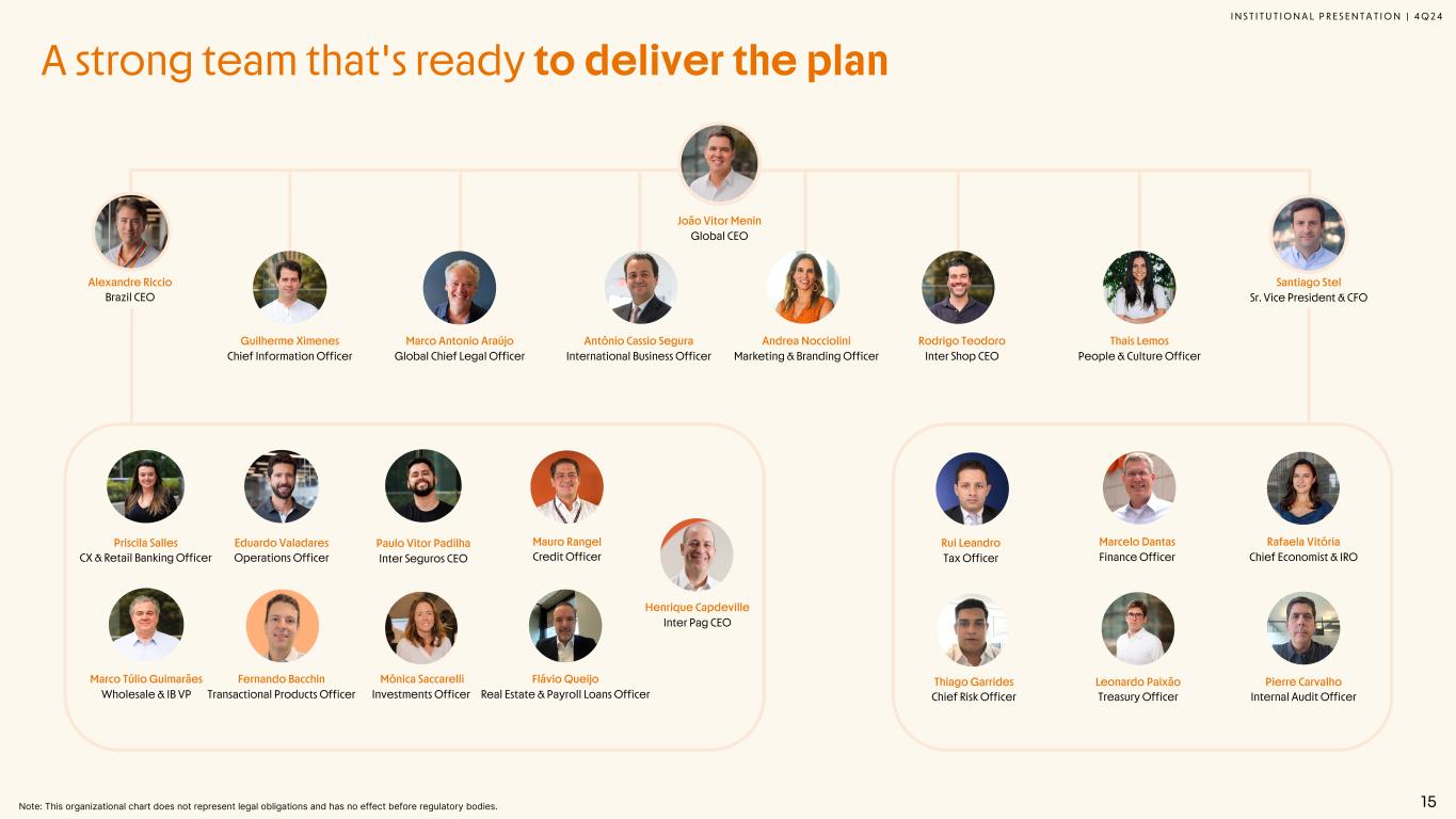 I N S T I T U T I O N A L P R E S E N T A T I O N | 4 Q 2 4 Guilherme Ximenes Chief Information Officer A strong team that's ready to deliver the plan Marco Antonio Araújo Global Chief Legal Officer Thais Lemos People & Culture Officer Antônio Cassio Segura International Business Officer Rodrigo Teodoro Inter Shop CEO Alexandre Riccio Brazil CEO Santiago Stel Sr. Vice President & CFO Rafaela Vitória Chief Economist & IRO Marcelo Dantas Finance Officer Flávio Queijo Real Estate & Payroll Loans Officer Rui Leandro Tax Officer Mônica Saccarelli Investments Officer João Vitor Menin Global CEO 15 Thiago Garrides Chief Risk Officer Fernando Bacchin Transactional Products Officer Leonardo Paixão Treasury Officer Pierre Carvalho Internal Audit Officer Andrea Nocciolini Marketing & Branding Officer Eduardo Valadares Operations Officer Paulo Vitor Padilha Inter Seguros CEO Priscila Salles CX & Retail Banking Officer Marco Túlio Guimarães Wholesale & IB VP Mauro Rangel Credit Officer Henrique Capdeville Inter Pag CEO Note: This organizational chart does not represent legal obligations and has no effect before regulatory bodies.