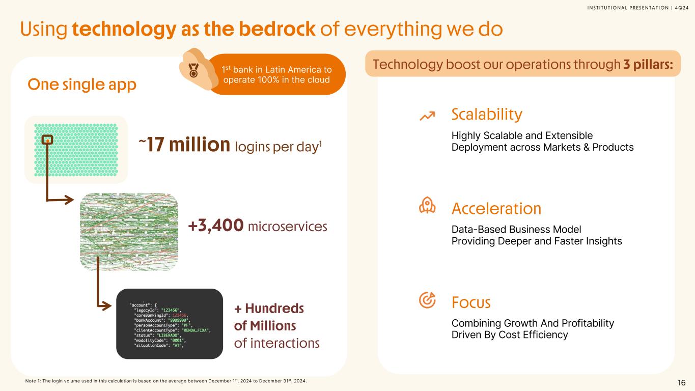 I N S T I T U T I O N A L P R E S E N T A T I O N | 4 Q 2 4 Using technology as the bedrock of everything we do 16 Acceleration Data-Based Business Model Providing Deeper and Faster Insights Focus Combining Growth And Profitability Driven By Cost Efficiency Scalability Highly Scalable and Extensible Deployment across Markets & Products Technology boost our operations through 3 pillars: One single app 1st bank in Latin America to operate 100% in the cloud ~17 million logins per day1 +3,400 microservices + Hundreds of Millions of interactions Note 1: The login volume used in this calculation is based on the average between December 1st, 2024 to December 31st, 2024.