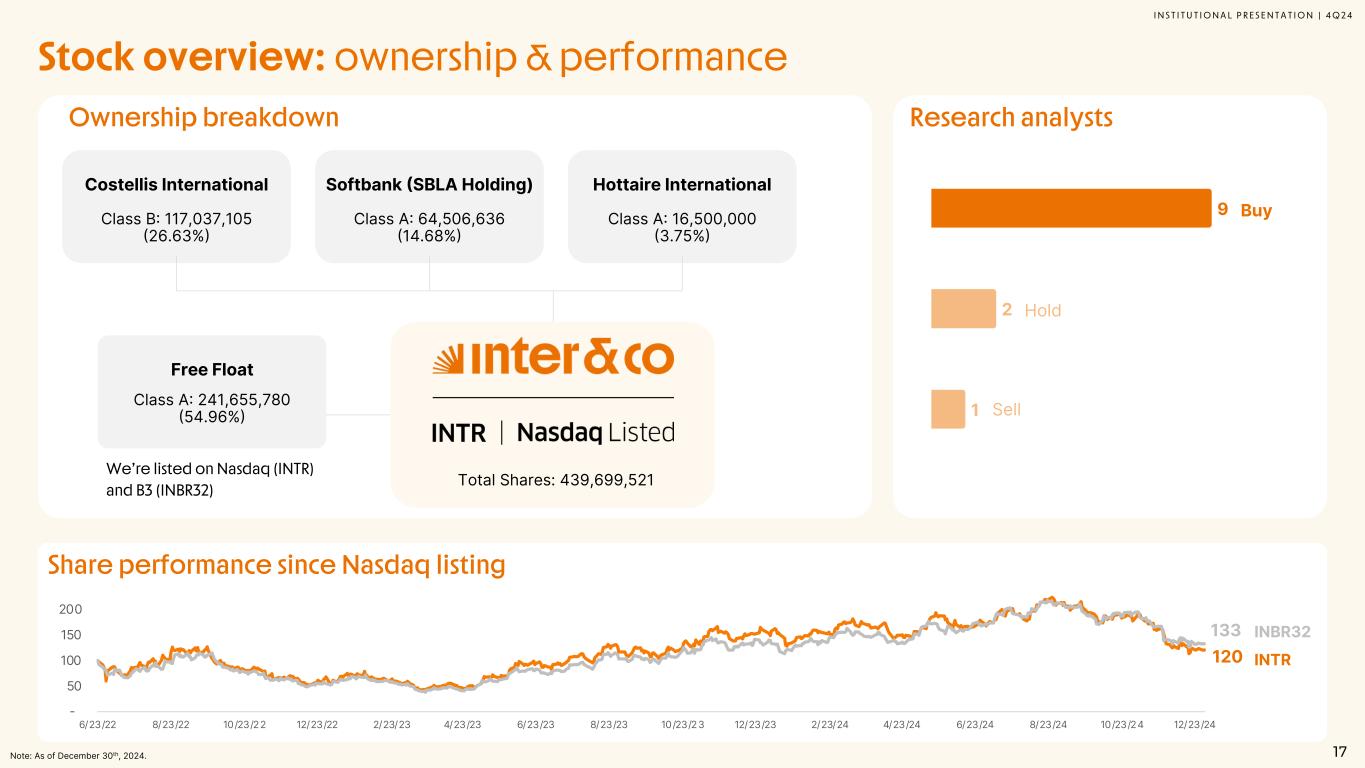 I N S T I T U T I O N A L P R E S E N T A T I O N | 4 Q 2 4 17 Stock overview: ownership & performance Costellis International Class B: 117,037,105 (26.63%) Softbank (SBLA Holding) Class A: 64,506,636 (14.68%) Hottaire International Class A: 16,500,000 (3.75%) Note: As of December 30th, 2024. Free Float Class A: 241,655,780 (54.96%) Total Shares: 439,699,521 Ownership breakdown Share performance since Nasdaq listing Research analysts We’re listed on Nasdaq (INTR) and B3 (INBR32) 120 133 - 50 100 150 200 6/23/22 8/23/22 10/23/22 12/23/22 2/23/23 4/23/23 6/23/23 8/23/23 10/23/23 12/23/23 2/23/24 4/23/24 6/23/24 8/23/24 10/23/24 12/23/24 INBR32 INTR 1 2 9 Buy Hold Sell
