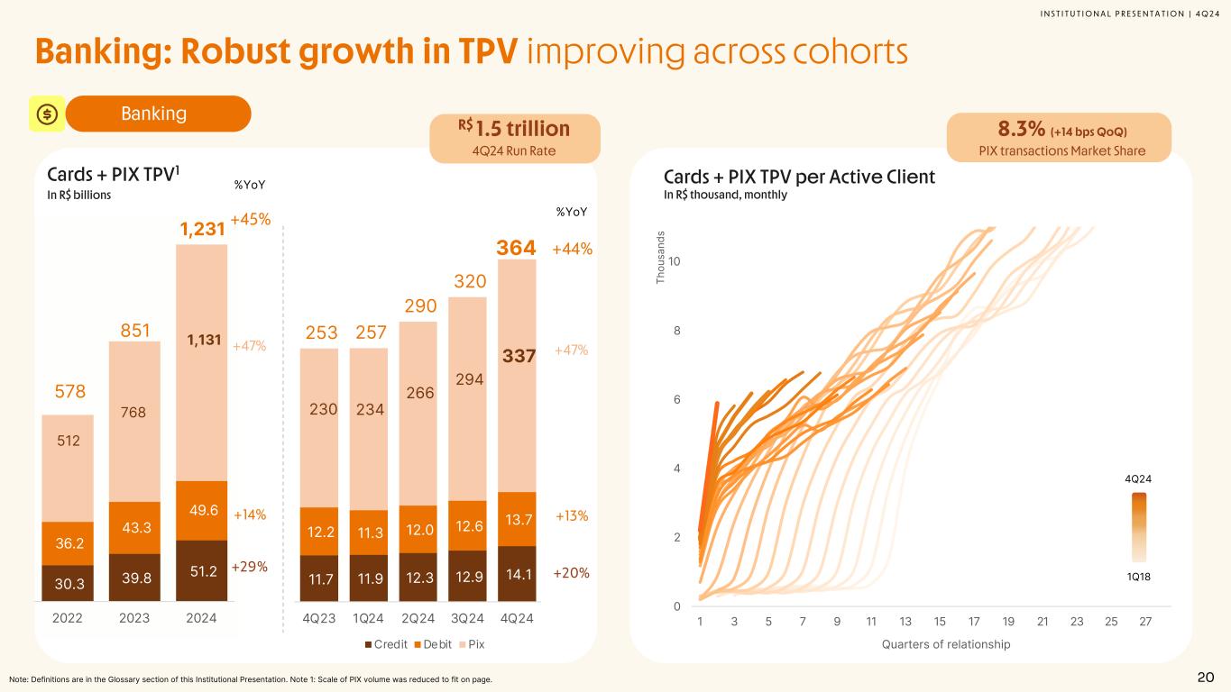 I N S T I T U T I O N A L P R E S E N T A T I O N | 4 Q 2 4 Banking Cards + PIX TPV per Active Client In R$ thousand, monthly Cards + PIX TPV1 In R$ billions Note: Definitions are in the Glossary section of this Institutional Presentation. Note 1: Scale of PIX volume was reduced to fit on page. 20 %YoY +44% +13% +20%11.7 11.9 12.3 12.9 14.1 12.2 11.3 12.0 12.6 13.7 230 234 266 294 337 253 257 290 320 364 - 1 0. 0 2 0 .0 3 0 .0 4 0 .0 5 0 .0 6 0 .0 7 0 .0 8 0 .0 9 0 .0 4Q23 1Q24 2Q24 3Q24 4Q24 Credit Debit Pix Quarters of relationship 8.3% (+14 bps QoQ) PIX transactions Market Share Banking: Robust growth in TPV improving across cohorts R$ 1.5 trillion 4Q24 Run Rate 30.3 39.8 51.2 36.2 43.3 49.6 512 768 1,131 578 851 1,231 - 5 0 .0 1 0 .0 1 50 .0 2 0 0. 0 2 50 .0 3 0 0. 0 3 50 .0 2022 2023 2024 %YoY +45% +47% +14% +29% 0 2 4 6 8 10 1 3 5 7 9 11 13 15 17 19 21 23 25 27 Th ou sa nd s 4Q24 1Q18 +47%