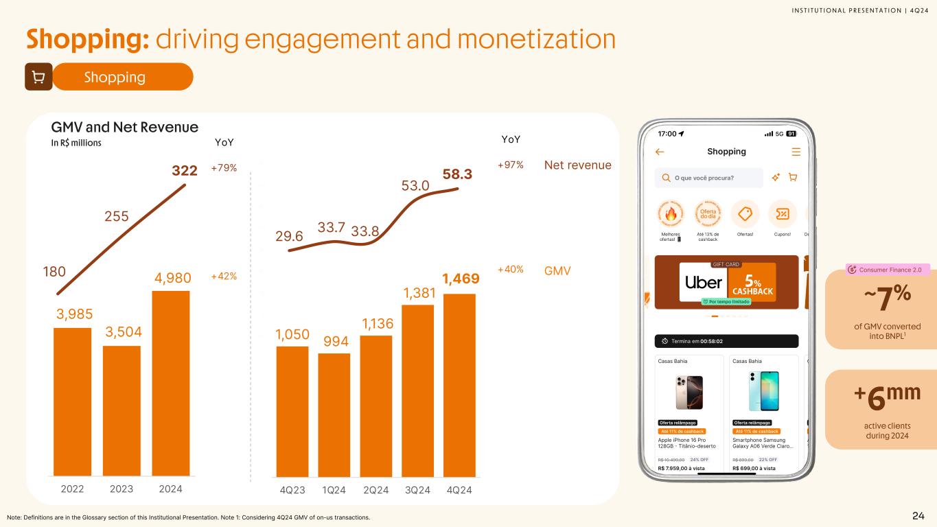 I N S T I T U T I O N A L P R E S E N T A T I O N | 4 Q 2 4 GMV and Net Revenue In R$ millions 3,985 3,504 4,980 2022 2023 2024 29.6 33.7 33.8 53.0 58.3 -10 0 10 20 30 40 50 60 70 180 255 322 0 50 100 150 200 25 0 300 35 0 1,050 994 1,136 1,381 1,469 4Q23 1Q24 2Q24 3Q24 4Q24 GMV Net revenue YoY +97% +40% YoY +79% +42% +6mm active clients during 2024 Shopping Note: Definitions are in the Glossary section of this Institutional Presentation. Note 1: Considering 4Q24 GMV of on-us transactions. Shopping: driving engagement and monetization 24 ~7% of GMV converted into BNPL1 Consumer Finance 2.0