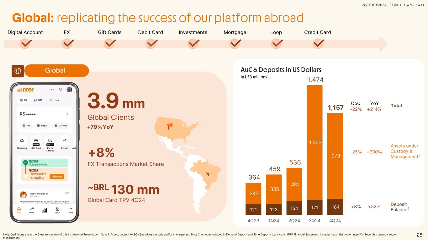 I N S T I T U T I O N A L P R E S E N T A T I O N | 4 Q 2 4 +8% FX Transactions Market Share mm Global Clients 3.9 +79%YoY ~BRL 130 mm Global Card TPV 4Q24 Assets under Custody & Management1 Deposit Balance2 Total Global: replicating the success of our platform abroad 25 Global 121 123 154 171 184 243 335 381 1,303 973 364 459 536 1,474 1,157 - 2 0 4 0 6 0 8 0 1 ,0 0 1 ,20 0 1 ,40 0 1 ,60 0 4Q23 1Q24 2Q24 3Q24 4Q24 Note: Definitions are in the Glossary section of this Institutional Presentation. Note 1: Assets under Inter&Co Securities custody and/or management. Note 2: Amount included in Demand Deposit and Time Deposits balance on IFRS Financial Statement. Includes securities under Inter&Co Securities custody and/or management. AuC & Deposits in US Dollars In USD millions QoQ YoY -22% +214% -25% +300% +8% +52% Digital Account FX Gift Cards Debit Card Investments Mortgage Loop Credit Card