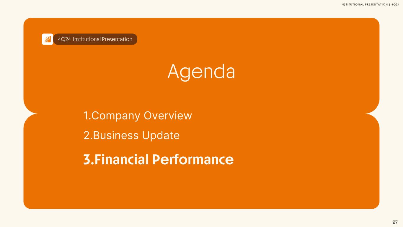 I N S T I T U T I O N A L P R E S E N T A T I O N | 4 Q 2 4 27 Agenda 1.Company Overview 2.Business Update 3.Financial Performance 4Q24 Institutional Presentation
