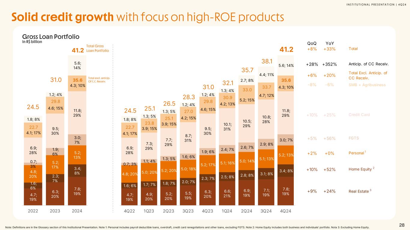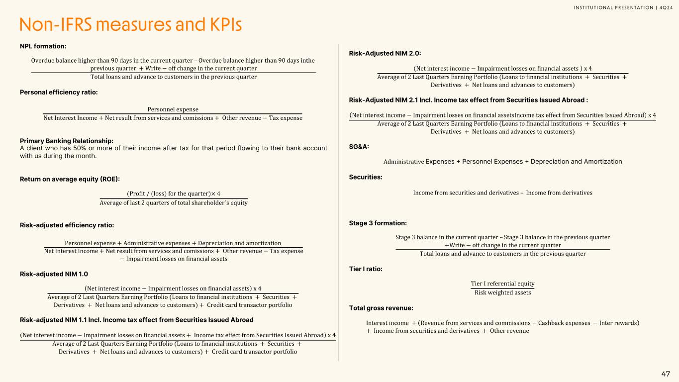 I N S T I T U T I O N A L P R E S E N T A T I O N | 4 Q 2 4 47 Non-IFRS measures and KPIs Risk-Adjusted NIM 2.0: Net interest income − Impairment losses on Minancial assets x 4 Average of 2 Last Quarters Earning Portfolio (Loans to Minancial institutions + Securities + Derivatives + Net loans and advances to customers) Risk-Adjusted NIM 2.1 Incl. Income tax effect from Securities Issued Abroad : Net interest income − Impairment losses on Minancial assetsIncome tax effect from Securities Issued Abroad x 4 Average of 2 Last Quarters Earning Portfolio (Loans to Minancial institutions + Securities + Derivatives + Net loans and advances to customers) SG&A: Administrative Expenses + Personnel Expenses + Depreciation and Amortization Securities: Income from securities and derivatives – Income from derivatives Stage 3 formation: Stage 3 balance in the current quarter – Stage 3 balance in the previous quarter +Write − off change in the current quarter Total loans and advance to customers in the previous quarter Tier I ratio: Tier I referential equity Risk weighted assets Total gross revenue: Interest income + Revenue from services and commissions − Cashback expenses − Inter rewards + Income from securities and derivatives + Other revenue NPL formation: Overdue balance higher than 90 days in the current quarter – Overdue balance higher than 90 days inthe previous quarter + Write − off change in the current quarter Total loans and advance to customers in the previous quarter Personal efficiency ratio: Personnel expense Net Interest Income + Net result from services and comissions + Other revenue − Tax expense Primary Banking Relationship: A client who has 50% or more of their income after tax for that period flowing to their bank account with us during the month. Return on average equity (ROE): (ProMit / (loss) for the quarter)× 4 Average of last 2 quarters of total shareholder`s equity Risk-adjusted efficiency ratio: Personnel expense + Administrative expenses + Depreciation and amortization Net Interest Income + Net result from services and comissions + Other revenue − Tax expense − Impairment losses on Minancial assets Risk-adjusted NIM 1.0 Net interest income − Impairment losses on Minancial assets x 4 Average of 2 Last Quarters Earning Portfolio (Loans to Minancial institutions + Securities + Derivatives + Net loans and advances to customers) + Credit card transactor portfolio Risk-adjusted NIM 1.1 Incl. Income tax effect from Securities Issued Abroad Net interest income − Impairment losses on Minancial assets + Income tax effect from Securities Issued Abroad x 4 Average of 2 Last Quarters Earning Portfolio (Loans to Minancial institutions + Securities + Derivatives + Net loans and advances to customers) + Credit card transactor portfolio