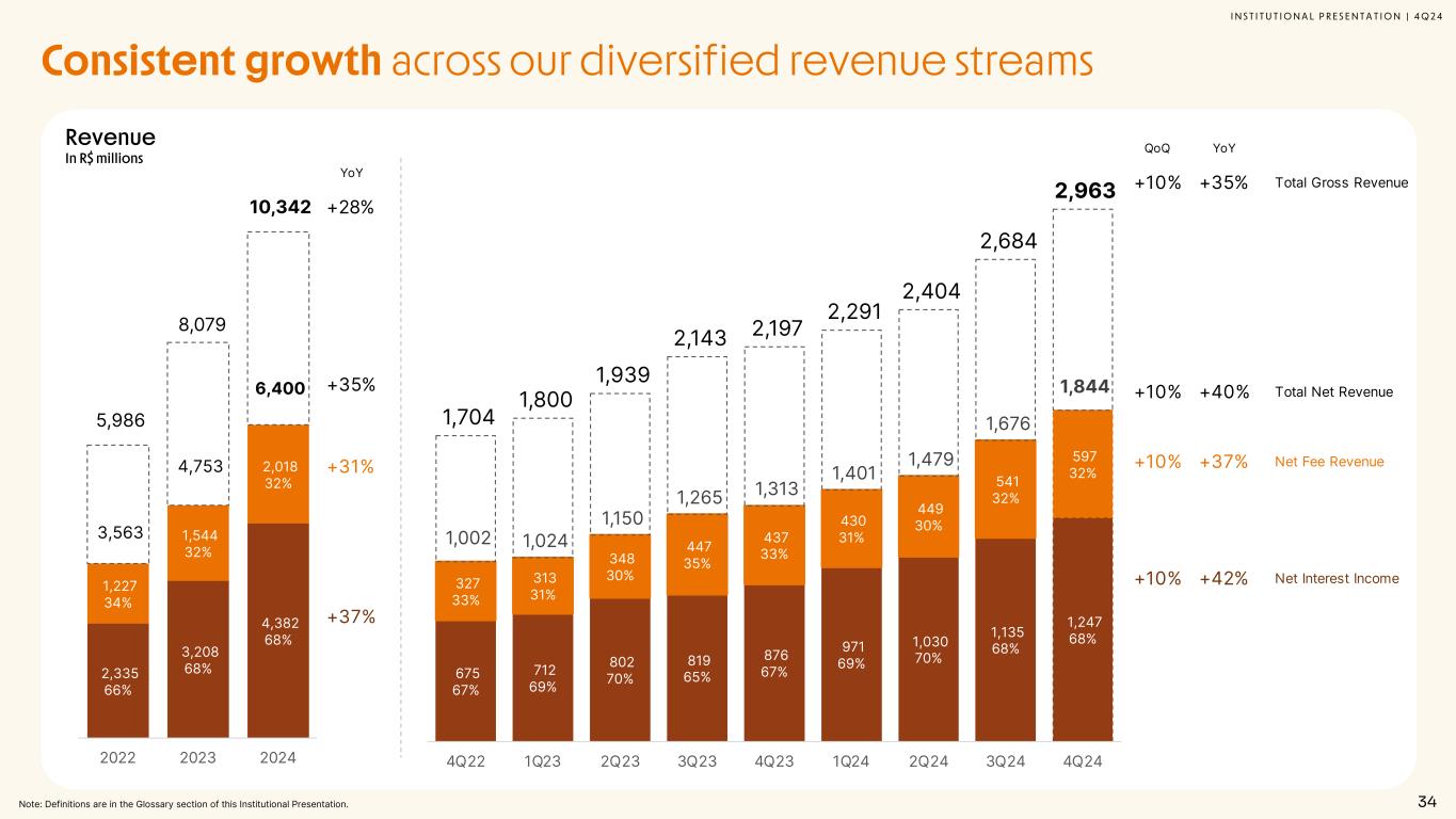 I N S T I T U T I O N A L P R E S E N T A T I O N | 4 Q 2 4 34Note: Definitions are in the Glossary section of this Institutional Presentation. 675 67% 712 69% 802 70% 819 65% 876 67% 971 69% 1,030 70% 1,135 68% 1,247 68% 327 33% 313 31% 348 30% 447 35% 437 33% 430 31% 449 30% 541 32% 597 32% 1,002 1,024 1,150 1,265 1,313 1,401 1,479 1,676 1,844 1,704 1,800 1,939 2,143 2,197 2,291 2,404 2,684 2,963 - 5 00 1, 00 0 1, 50 0 2 ,0 00 2 ,50 0 3 ,0 00 4Q22 1Q23 2Q23 3Q23 4Q23 1Q24 2Q24 3Q24 4Q24 QoQ YoY +10% +35% Total Gross Revenue +10% +40% Total Net Revenue +10% +37% Net Fee Revenue +10% +42% Net Interest Income Revenue In R$ millions 2,335 66% 3,208 68% 4,382 68% 1,227 34% 1,544 32% 2,018 32% 3,563 4,753 6,400 5,986 8,079 10,342 - 2 ,0 00 4 ,0 00 6 ,0 00 8 ,0 00 10 ,0 00 12 ,0 00 2022 2023 2024 YoY +28% +35% +31% +37% Consistent growth across our diversified revenue streams