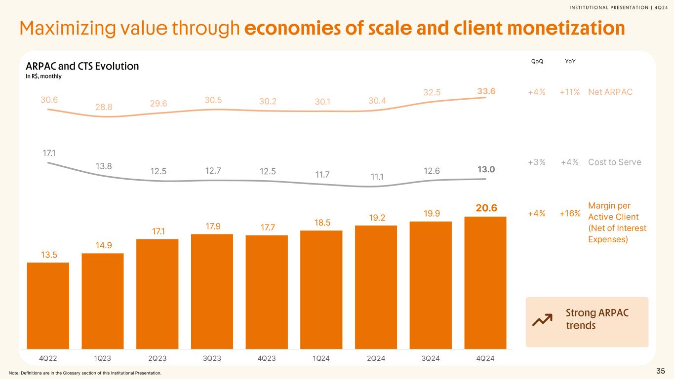 I N S T I T U T I O N A L P R E S E N T A T I O N | 4 Q 2 4 ARPAC and CTS Evolution In R$, monthly Maximizing value through economies of scale and client monetization 35 Strong ARPAC trends 13.5 14.9 17.1 17.9 17.7 18.5 19.2 19.9 20.6 30.6 28.8 29.6 30.5 30.2 30.1 30.4 32.5 33.6 17.1 13.8 12.5 12.7 12.5 11.7 11.1 12.6 13.0 4Q22 1Q23 2Q23 3Q23 4Q23 1Q24 2Q24 3Q24 4Q24 QoQ YoY +4% +11% Net ARPAC +3% +4% Cost to Serve +4% +16% Margin per Active Client (Net of Interest Expenses) Note: Definitions are in the Glossary section of this Institutional Presentation.